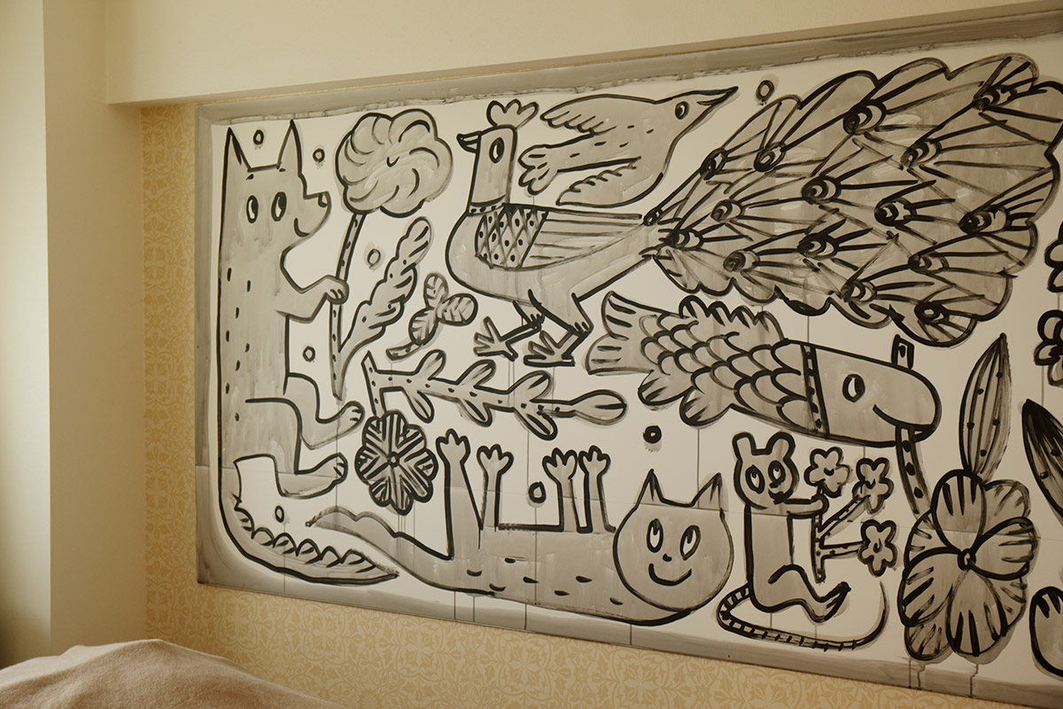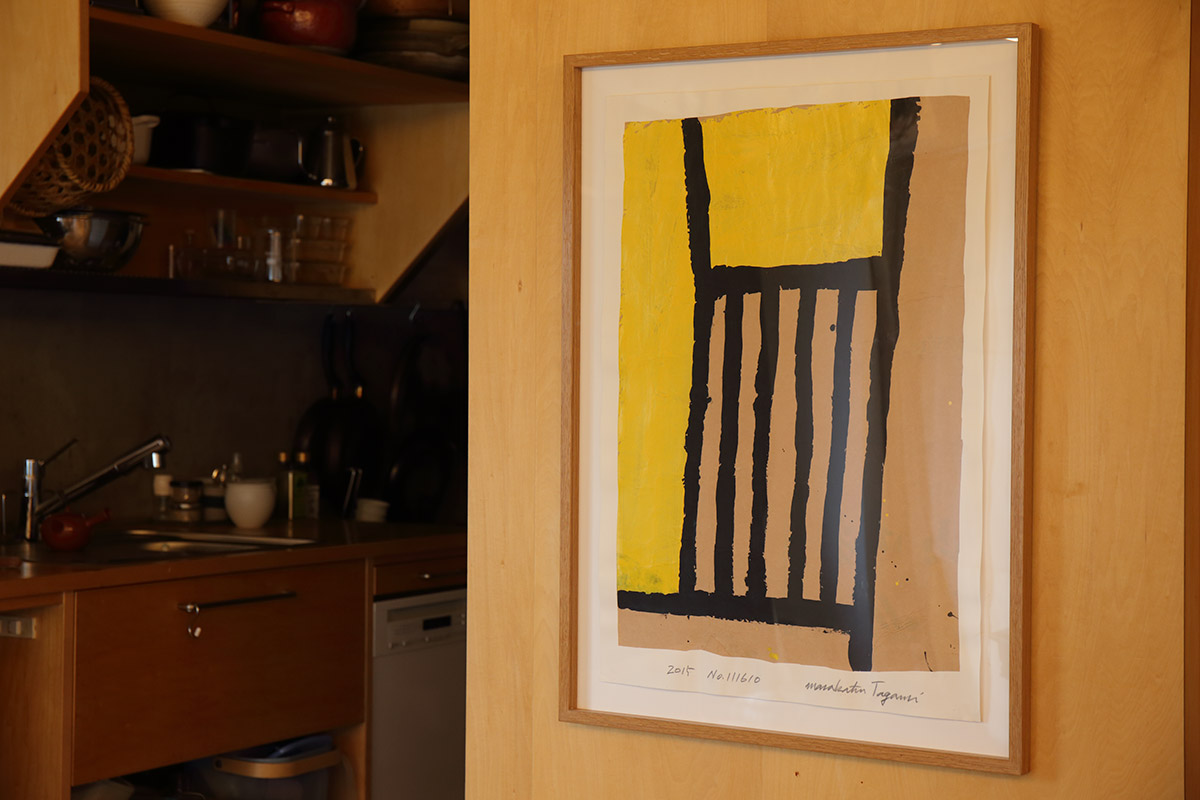 「どこかで心惹かれるモノに出会うと、どこにどのように飾ろうなどとはあまり考えず、“連れて帰る”パターンが多いですが、部屋をリフォームした際、この壁だけにはきっちりと何か大きなものをと思い、田上允克(たがみまさかつ)さんのこの絵を購入しました。田上さんは毎日平均3~7枚ほどの絵を自由闊達に描き続けている方です。この作品は梱包紙に使うような紙の裏に描かれたもので、質感が残っている素朴な雰囲気が好きです。友人に、この絵があることで“部屋がきれいに見える”と勧められました」