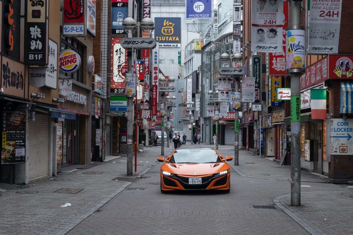 西武の角を曲がり、“変わらぬ渋谷”の象徴であるセンター街へと乗り入れる。一方通行が入り組んだ迷路のような繁華街。たとえスーパーカーであってもウォーキングスピードを余儀なくされるこのエリアにおいて、NSXは見事にその気配を消す。フロントに2つ、リアに1つ、計3つのモーターを配する21世紀型ハイブリッド・スポーツカーは、電気モーターでのみ走ることを可能にする「クワイエット・モード」を備えている。