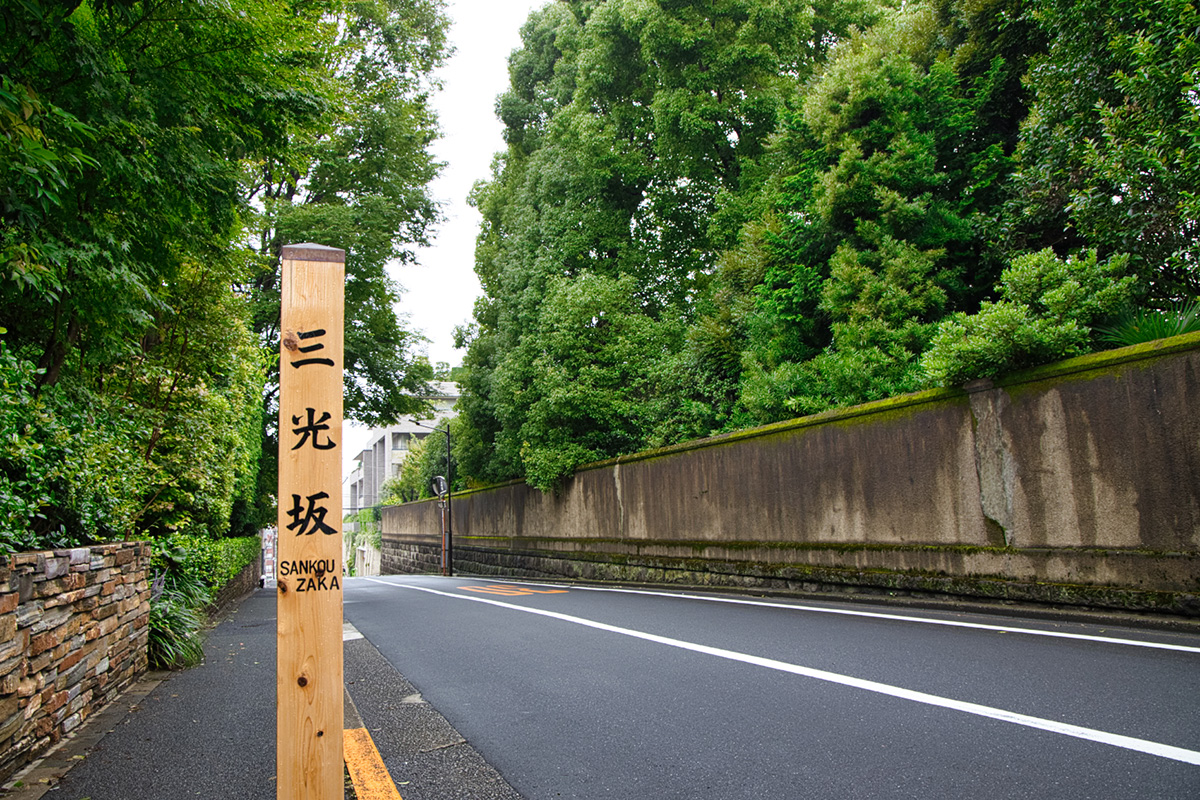左には、蜀江坂(しょっこうざか)というゆるやかな傾斜の坂がある。白金4丁目と6丁目の境界となっており、聖心女子学院のレンガ塀が見える。坂の名前は、明治期に紅葉が美しかったことから、紅葉で知られる中国の蜀江にちなんでいる。当時の知識人には漢文が必須であり、その教養を披歴したあとがうかがえる。