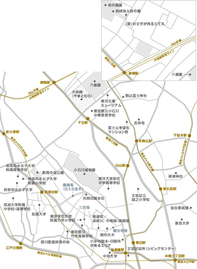 その後、三菱財閥は周辺を邸宅地として開発し、上流階級に選ばれていく。文京区外だが、近隣の染井エリアもそのひとつで、現在も邸宅街として上品な面影を残している。この街の礎を築いた岩崎弥太郎は、この地域にある染井霊園に墓が建てられた(現在は隣接する個人敷地に埋葬されている)。