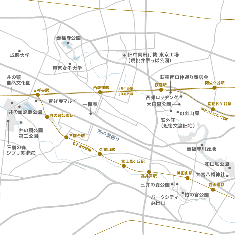 杉並区から武蔵野市へ歩きながら、多くの文化財や史跡を目にしてきた。文化の薫りを漂わせる建築領域の遺産をのこしつつ、街づくりの思想がこの一帯を住みよい環境へと導いてきたことが伺える。武蔵野台地の面影が残る点では世田谷区の邸宅地と似ているが、世田谷と異なるのは、駅前商業地、住宅地、公園がエリアを分けて存在しながら、先述した杉並区の区画整理のように、道幅にも配慮した整備がされていることで街全体の解放感が保たれているのではないか。そんなことを念頭にこの街を歩いてみると、きっと新たな発見があるだろう。