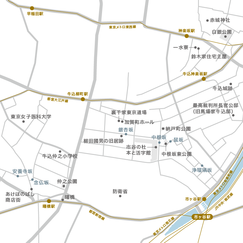 曙橋から坂を上り、高台が続く市ヶ谷エリアを抜け、さらに坂を上って赤城神社へと向かう。その道すがらには、江戸から令和へと続く時間の堆積を物語る地名や建物が、いまもなお点在している。それらの記憶のかけらは、急速な都市開発の波にのまれ、やがて過去のものとなってしまうかもしれない——そんな焦りを感じながらも、重層的な歴史の手触りを味わえることが、市ヶ谷という街を歩く醍醐味なのかもしれない。