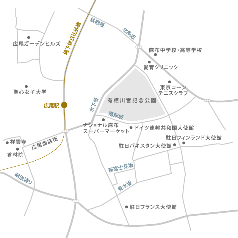 広尾駅から階段を上り地上に出ると、明らかに他の街とは異なる、空気にほんのりと清涼感を覚える。通りには背筋がスッと伸びた多種多様な国々の人が爽やかな笑顔で行き交っているが、おそらくそれとは別の、自然がもたらすクリアな空気だ。すぐ近くに広大な有栖川宮記念公園があるからだろうか……。まずは公園へ足を運ぶことにした。