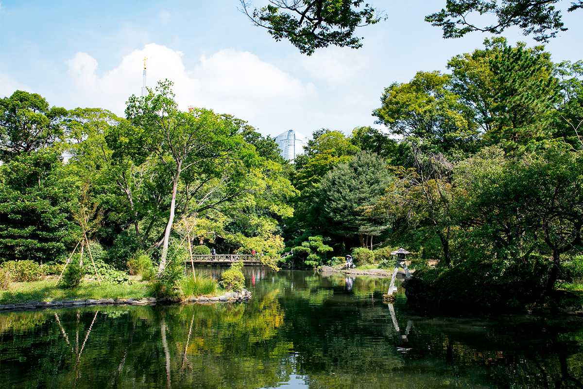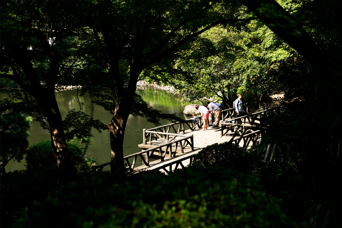 宮様ゆかりの憩いの日本庭園で外国人や子どもたちが遊ぶ