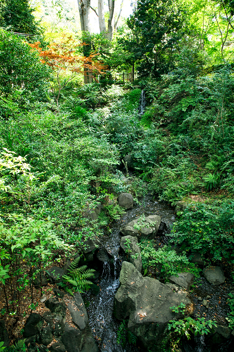 麻布台地の高低差を生かした庭園には、滝、丘、渓谷、池がコンパクトにまとまっている