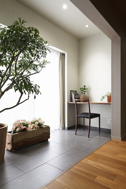こちらの事例は、窓際にインナーテラスを設けた事例。床面をタイル貼りにすることでリビングから続くテラスのような、サンルームのような、気持ち良い空間ができました。
