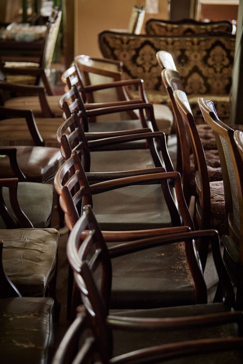 2棟で構成された工房を訪れると、2階建ての建物の入り口近くに修理を待つ家具がずらりと並んでいた。消耗の激しいレストランやホテルの家具修理が多いというが、個人からの修理依頼にも1点から対応している。