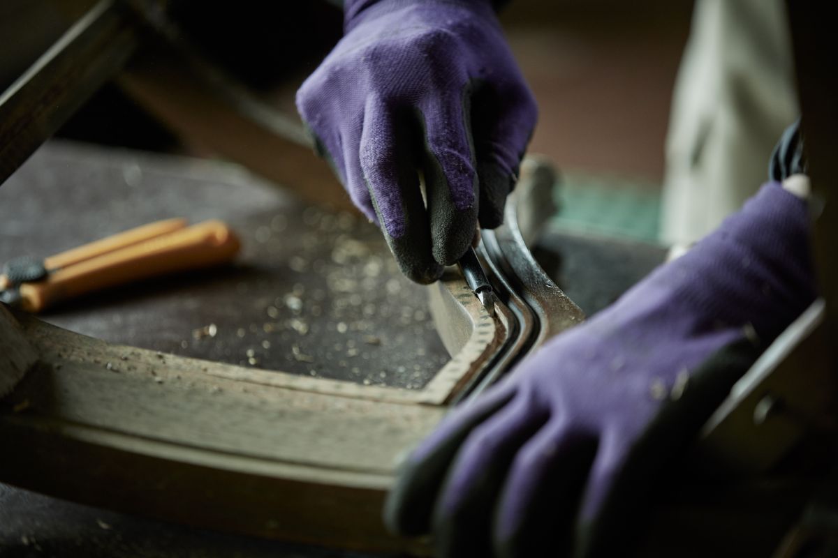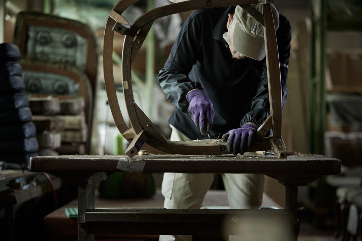 「ここに持ち込まれる家具の状態は、たとえ同じ製品であってもそれぞれに異なります。さらに、お客さまによってあえて残したい傷があったり、予算の関係ですべてではなく一部のみの張り替えを希望されたりと、修理への要望はさまざま。職人はどこをどのようになおすのか自らの目で見極め、ほとんどの工程を手作業で行っています」