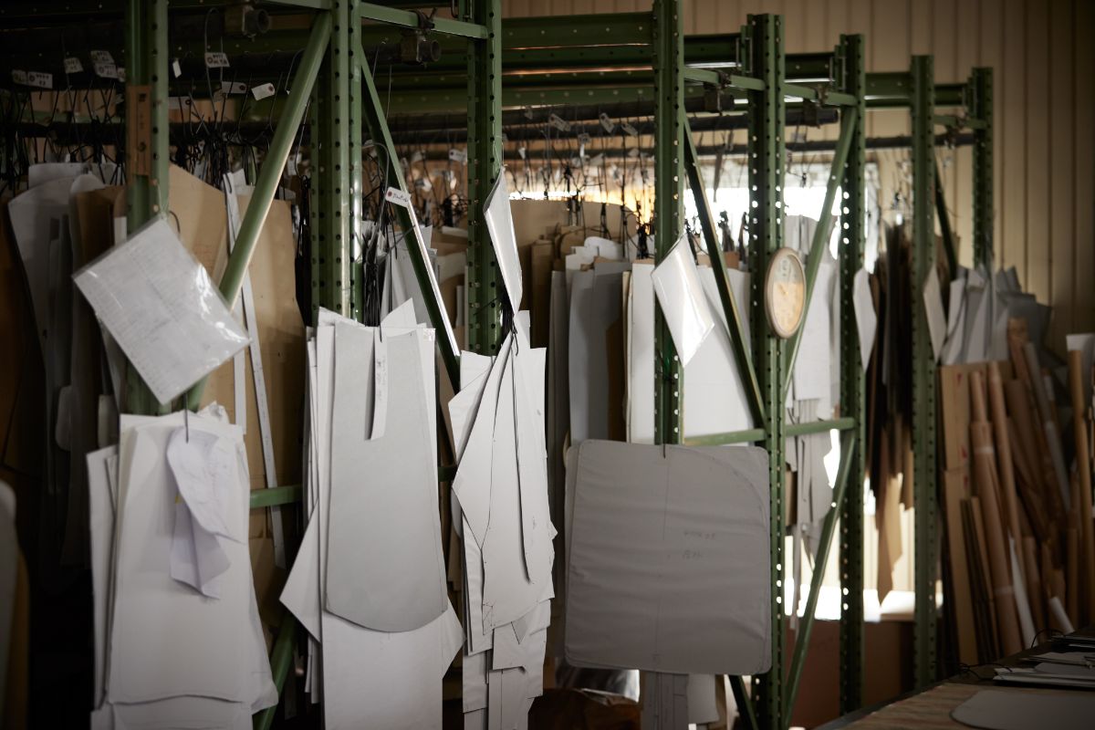 張り地を裁断する工房2階のコーナーには、壁際にずらりと張り地の型紙が並んでいた。長い歴史を持つマルニ木工の修理専門会社として、同社が大切に保管しているのがこの型紙だ。これまで無数の製品を生み出してきたことに加え、同じ製品でもマイナーチェンジを重ねていくため、型紙の数は膨大になっている。
