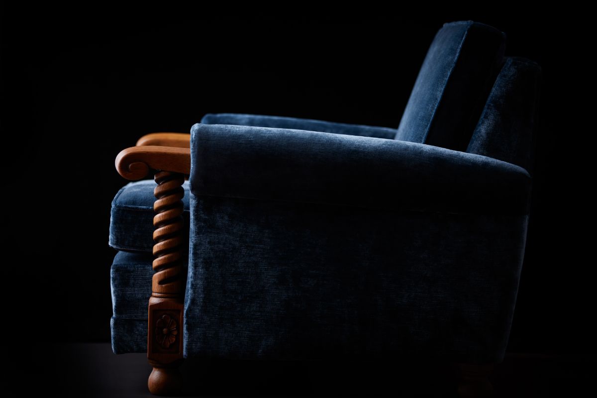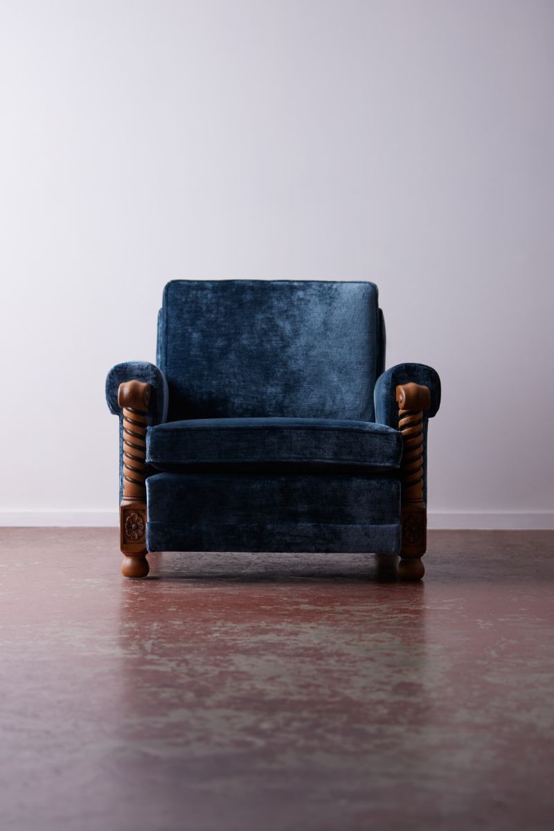 リノベーションによりブルーグレーのベルベットに張り替えられたアームチェアや、元の艶のある塗装をはがし、ほのかに白くマットな仕上げが施されたサイドテーブルは、エジンバラならではの華やかさを備えながらも驚くほどにモダンだ。現代の住まいに新鮮な印象をもたらし、主役となる特別な存在感を放つだろう。