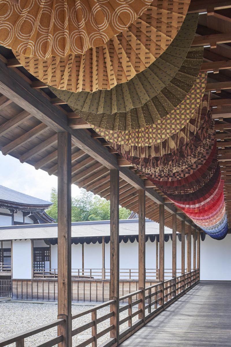 ここでは境内に仏塔のような立体作品を置き、庫裡から本堂まで70mある渡り廊下にテキスタイルの扇「扇の舞」を設えました。扇は計122枚にのぼり、白から黄色、赤、藍、黒までグラデーションでつなげていますが、これは修復工事が完了したときに本堂に飾られていた五色旗を意識したものです。