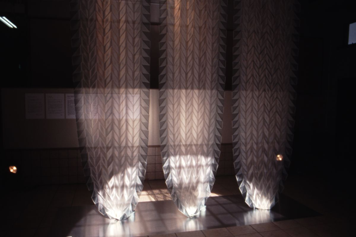 もう一つの講堂では、音と映像をからめて布を見せようと考えました。当時ダムタイプのメンバーだった南琢也さんにお願いし、映像は当時活動し始めたばかりの新進気鋭、異色の建築家、松川昌平さんと倉持正之さん(000studio/ゼロスタジオ)にお願いしました。