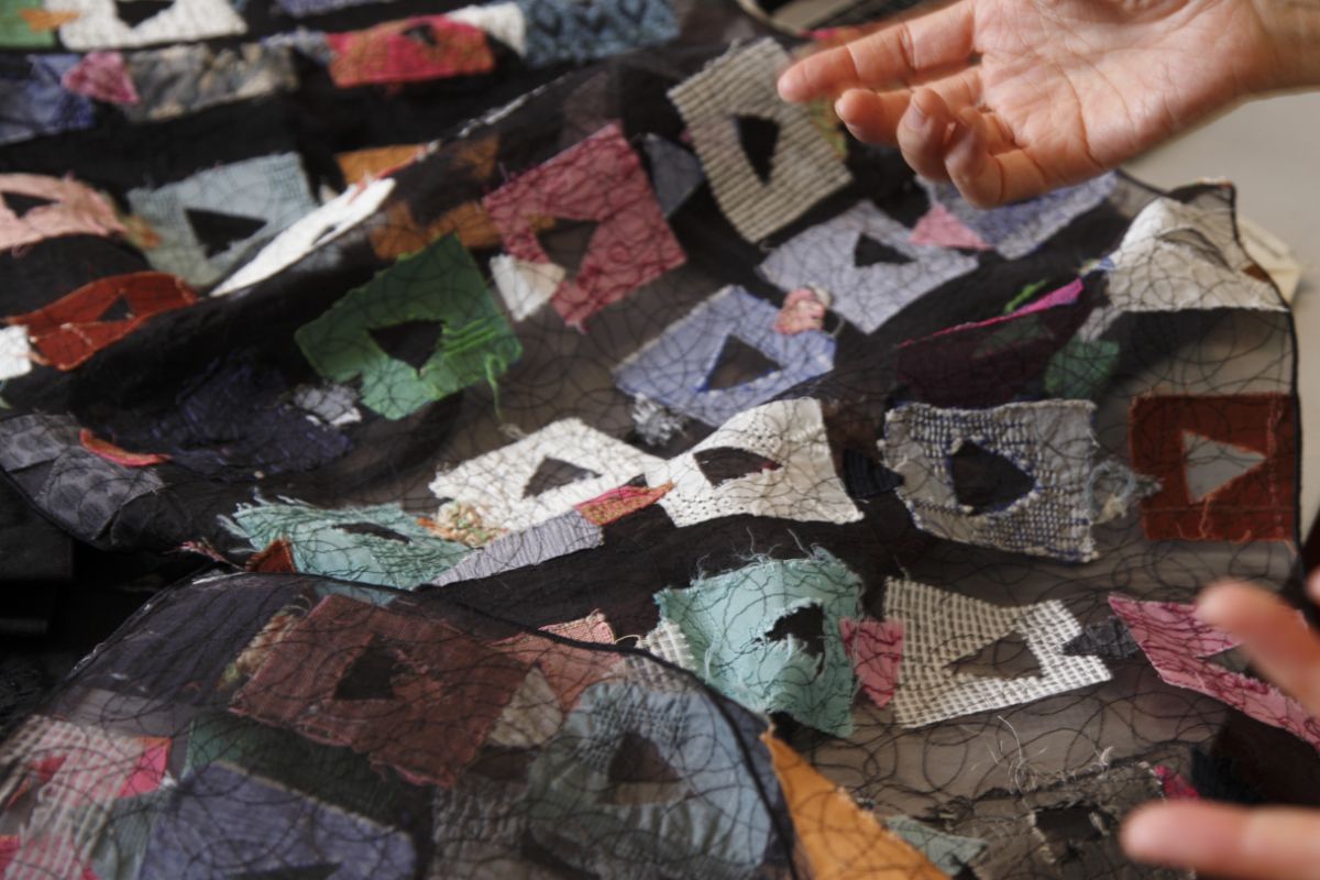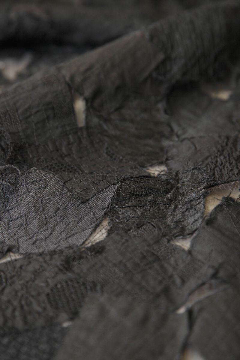 売れ残ったものや、布製品を作る過程で出た残布、失敗作やサンプルなどで、設立から10年たった頃にはいわゆる不良在庫の山になっていました。そこで考えたのが「つぎはぎ」というシリーズ。そういう行き場のないテキスタイルを全部黒に染めて、つなぎ合わせて布地にしました。魅力あるデザインにするにはとんでもない手間がかかるものですが、それをちゃんと素材として伝えたいと思い、今も作り続けています。