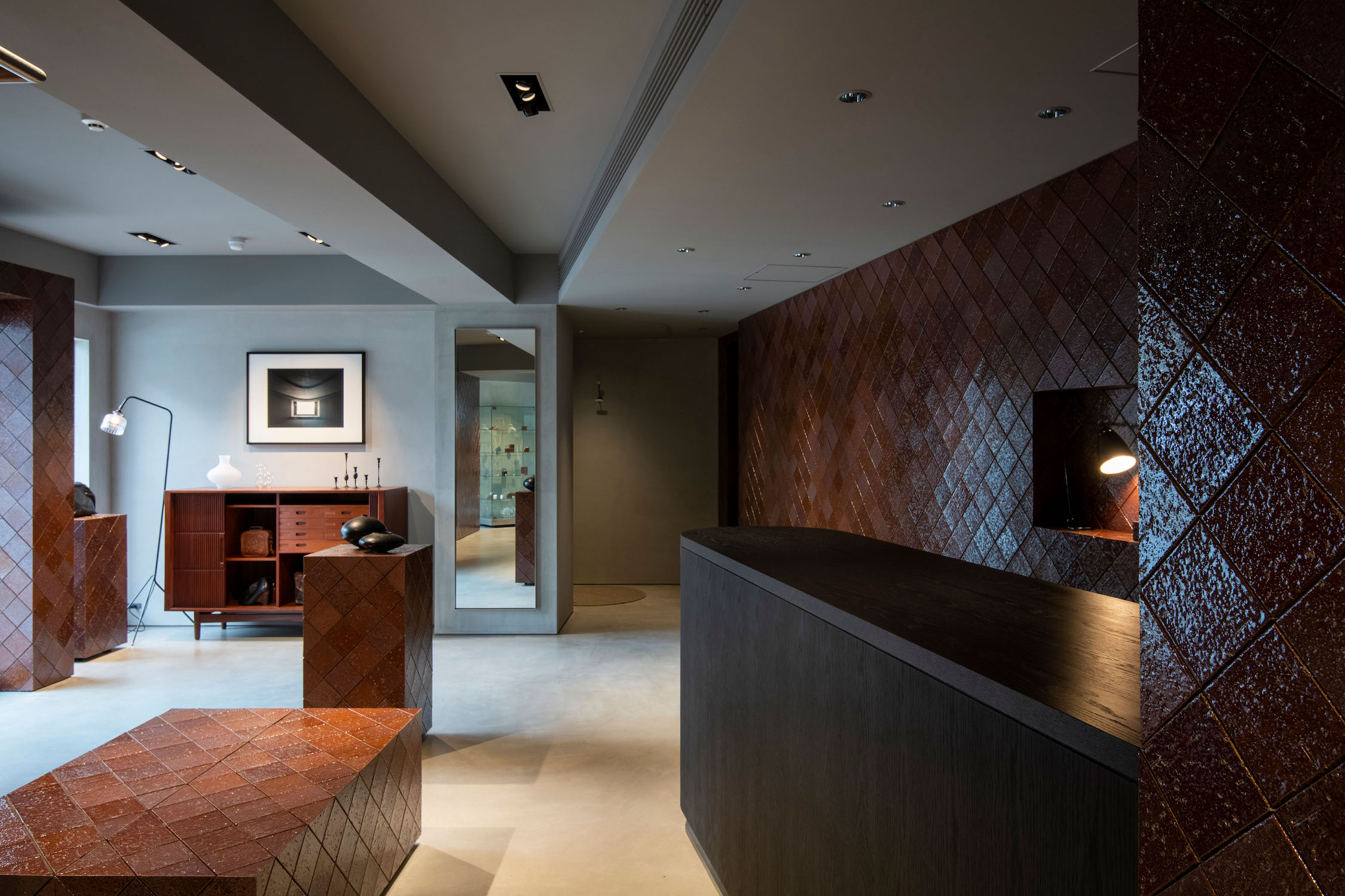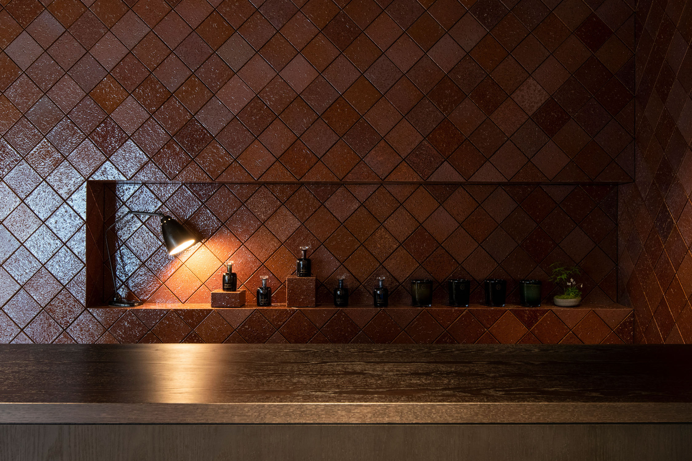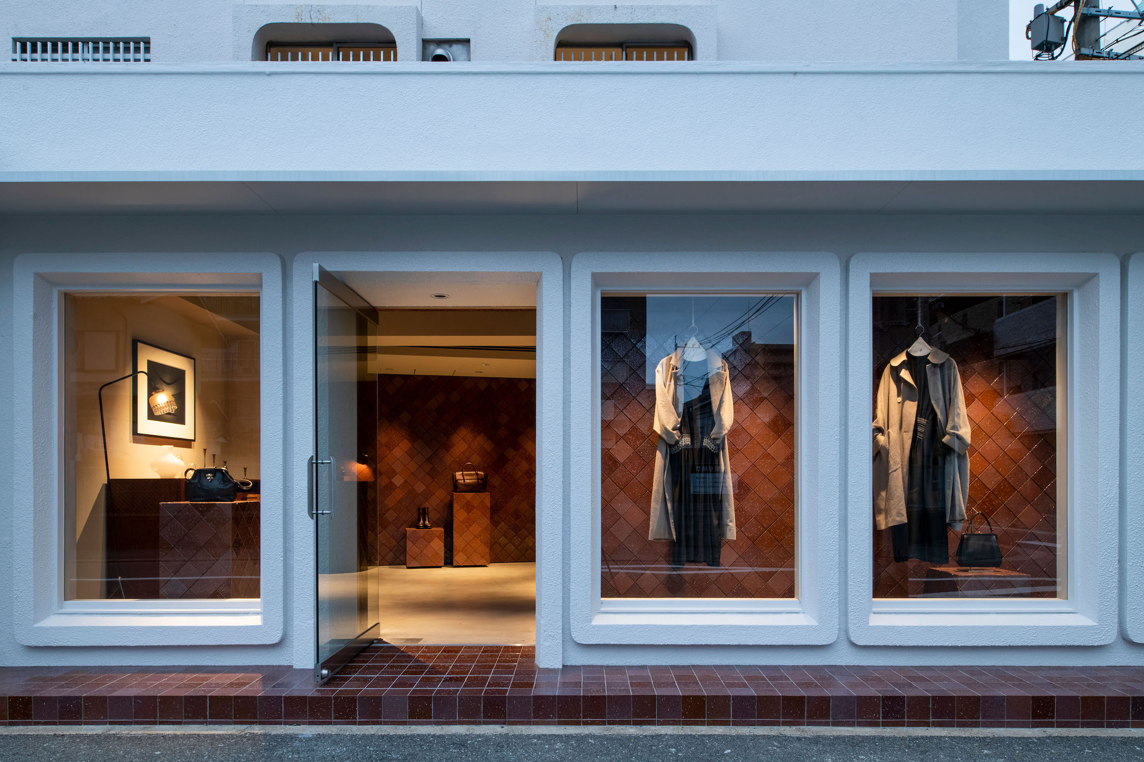 内装に使ったタイルは福岡市美術館とまったく同じではないのですが、四半目地といってタイルを45度傾けて貼り、美術館のディテールを踏襲しました。エレガントに見える貼り方なので、アーツ&サイエンスのイメージにもよく合っています。コーナー部分を立体的に仕上げるのがとても難しく、そこは苦労しましたが、施工者やタイルメーカーとも打ち合わせを重ね、時間をかけて解決しました。店舗が入っているのは築40年以上の古いマンションで、特徴的な開口部があるのでそれを生かしてデザインしています。