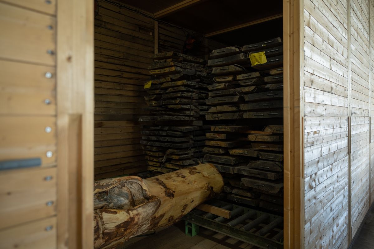 また、こだわりは乾燥工程にも及ぶ。天日干しによって水分含有率が20%ほどまで下がった丸太は、製材後、人工乾燥機によって残りの水分が抜けるまでさらに乾燥させられる。その際、通常はビジネスサイクルを早めるため、60℃〜80℃という高温の人工乾燥機で急速に乾燥させる場合が多い。しかし同社は、40℃ほどの低温でじっくりと水分を抜く手法を取っている。