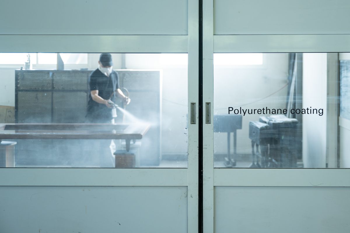 「化学的な樹脂を表面にコーティングするウレタンコーティングは、水分や油分を弾きメンテナンスが楽になる半面、木の調湿効果を限りなく減らすことになります。また、化学的な加工は8年から10年ほど経つと劣化が進み、いくら大事に使っていても表面が剥離してしまいます。そういう理由から、我々はホテルやレストラン向けにはウレタンコーティングをお勧めすることはありますが、一般のご家庭で使用されるお客さまには、長期的にご自身でメンテナンスができるビーズワックスでの仕上げをお勧めしています」