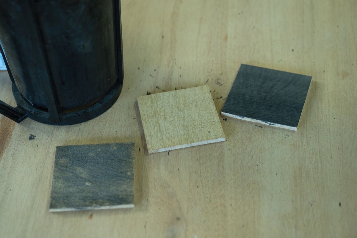 もうひとつ紹介してくれたのは、「鉄媒染」という手法。鉄媒染用の鉄水(鉄分を多く含んだ水)をナラ材にサッと塗ると、鉄がナラ材に含まれる渋(いわゆるタンニン)と反応して化学反応を起こし、1時間もしないうちに黒く変色していく。