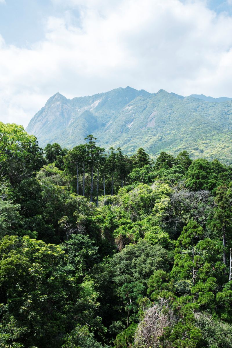 その島は上空から見下ろすと、こんもりとした緑に覆われ、島自体がひとつの巨大な森のようだった。「洋上のアルプス」とも称される屋久島は、1周約130km、約504㎢の面積に、1000m級の山が40座以上連なり、九州最高峰の宮之浦岳(1936m)を有する。ほぼ円形の土地に急峻な山々を擁する屋久島が、たとえばタジン鍋のような姿だったとしたら、最高峰が282mしかない隣の種子島はナンのように細長く平坦な島。薩南諸島最大の奄美大島ですら最高峰は694mであることからも、ここ屋久島が際立って個性的な島であることが分かる。