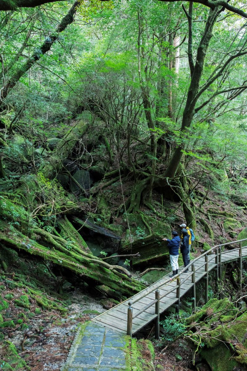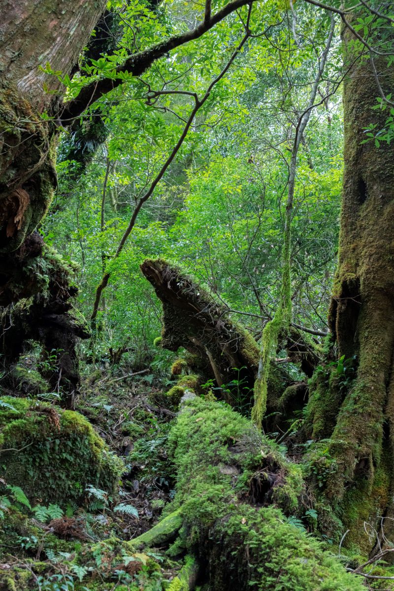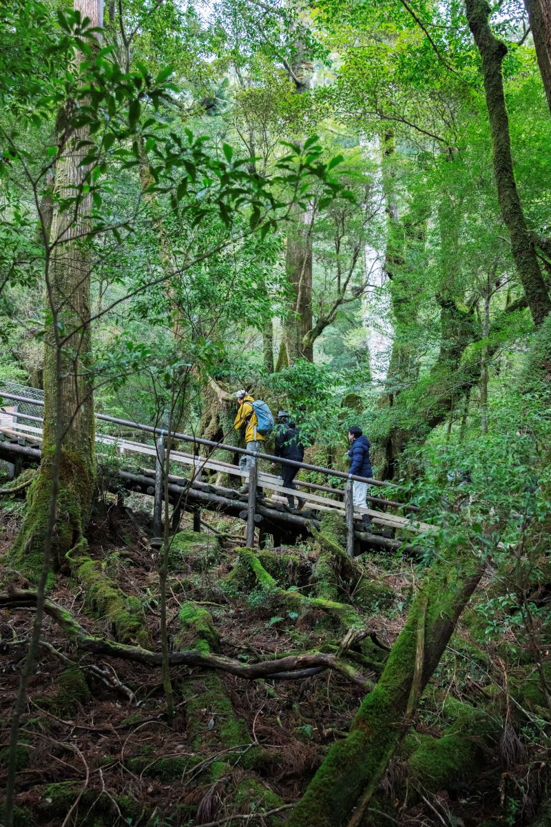 ヤクスギランドの整備された石道と木道は、天候が良い日であれば履き慣れた運動靴で安全に歩くことができる。この日は荒川橋からハイライトともいえる仏陀杉へショートカットする50分(1.2㎞)のコースを歩くことに。びっしりと苔に覆われた岩が森の入口で出迎えてくれる。昼なお暗い厳かな森の空気は、ひやりとして湿潤。常緑樹の照葉樹林の森から始まり、標高により徐々に北日本に似た森林へと移り変わる。