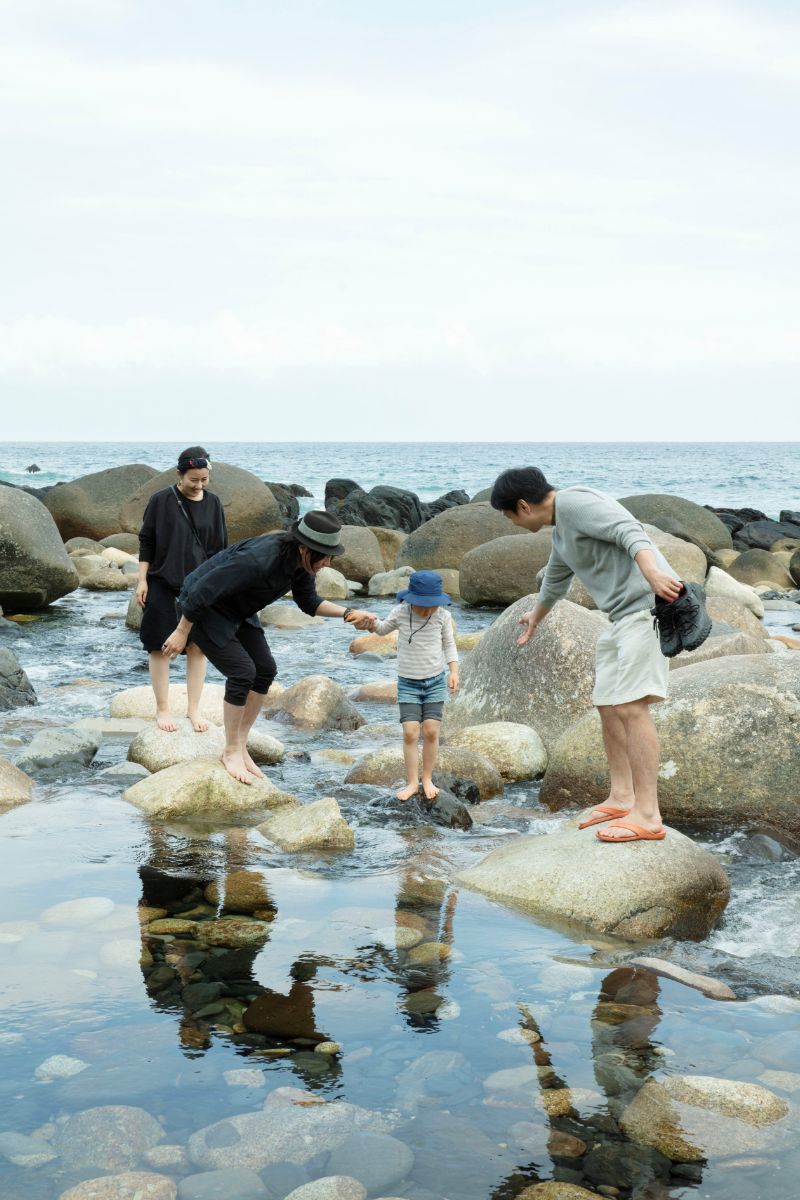 小野さんや今村さんと合流した初日、まず連れて行ってくれたのは、Sumuから森の小路を15分ほど下ったところに広がる岩石海岸であった。途中、森のほうからきりりと涼やかな風が吹き抜けてくる。「ここは風が動く場所で、水が動く場所でもある。目に見えていなくても、土の中を水が流れているんです」と今村さんが説明してくれる。