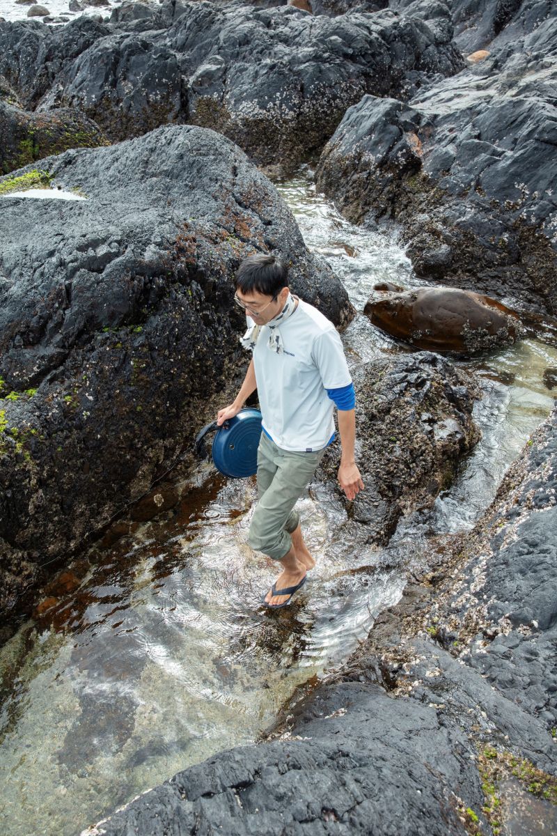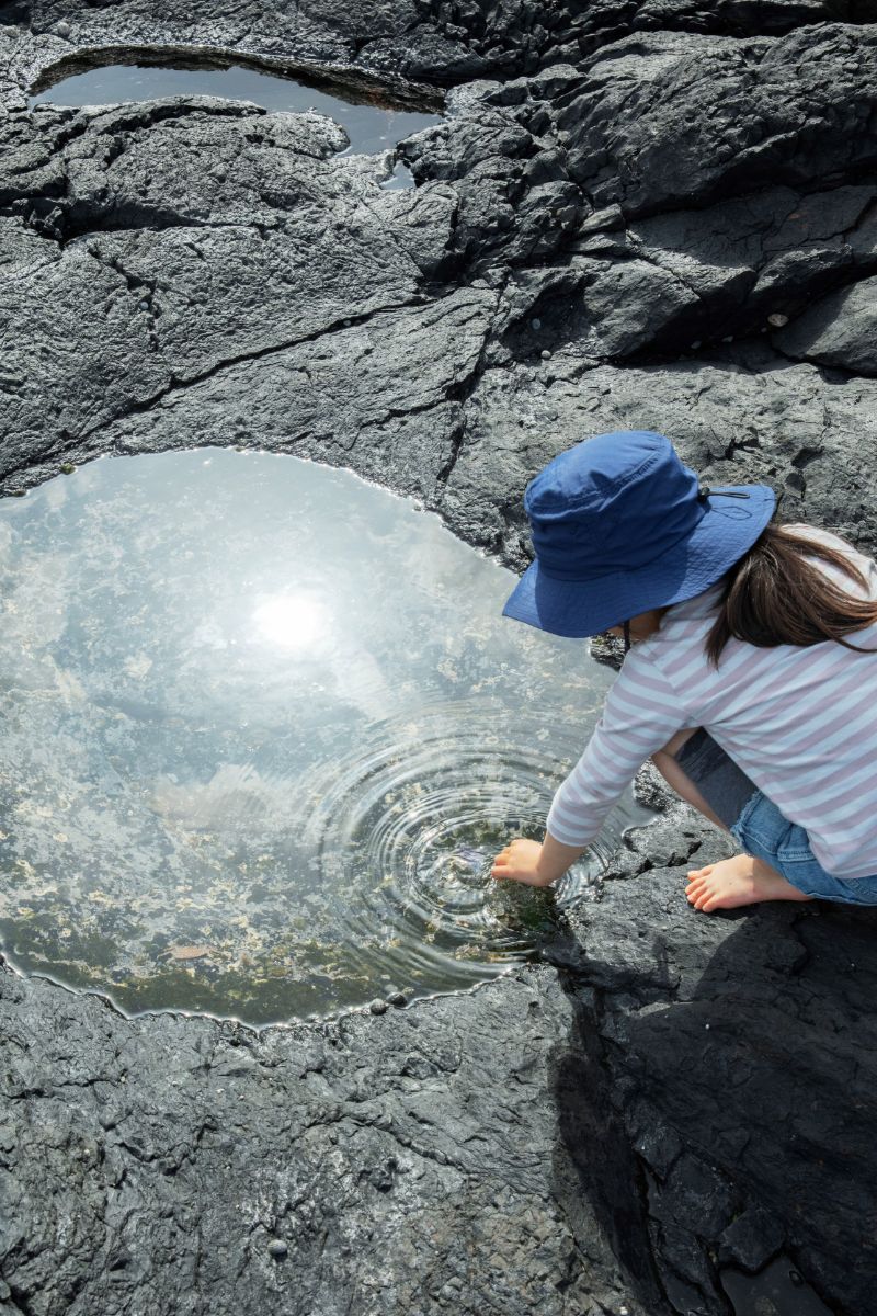 海岸には、これが水の力によって運ばれたものかと驚くような巨岩がひしめいている。岩礁にできた潮だまりを飛び越えながら先に進む。最初は恐々だったが、徐々に体が軽く動くように感じられる。タイドプールとも言われる大小の潮だまりに、小さな魚や甲殻類、海虫などの姿を見つける。波打ち際の岩をびっしりと覆う黒い藻のようなものは「シオノバクテリア(藍藻)」という細菌。