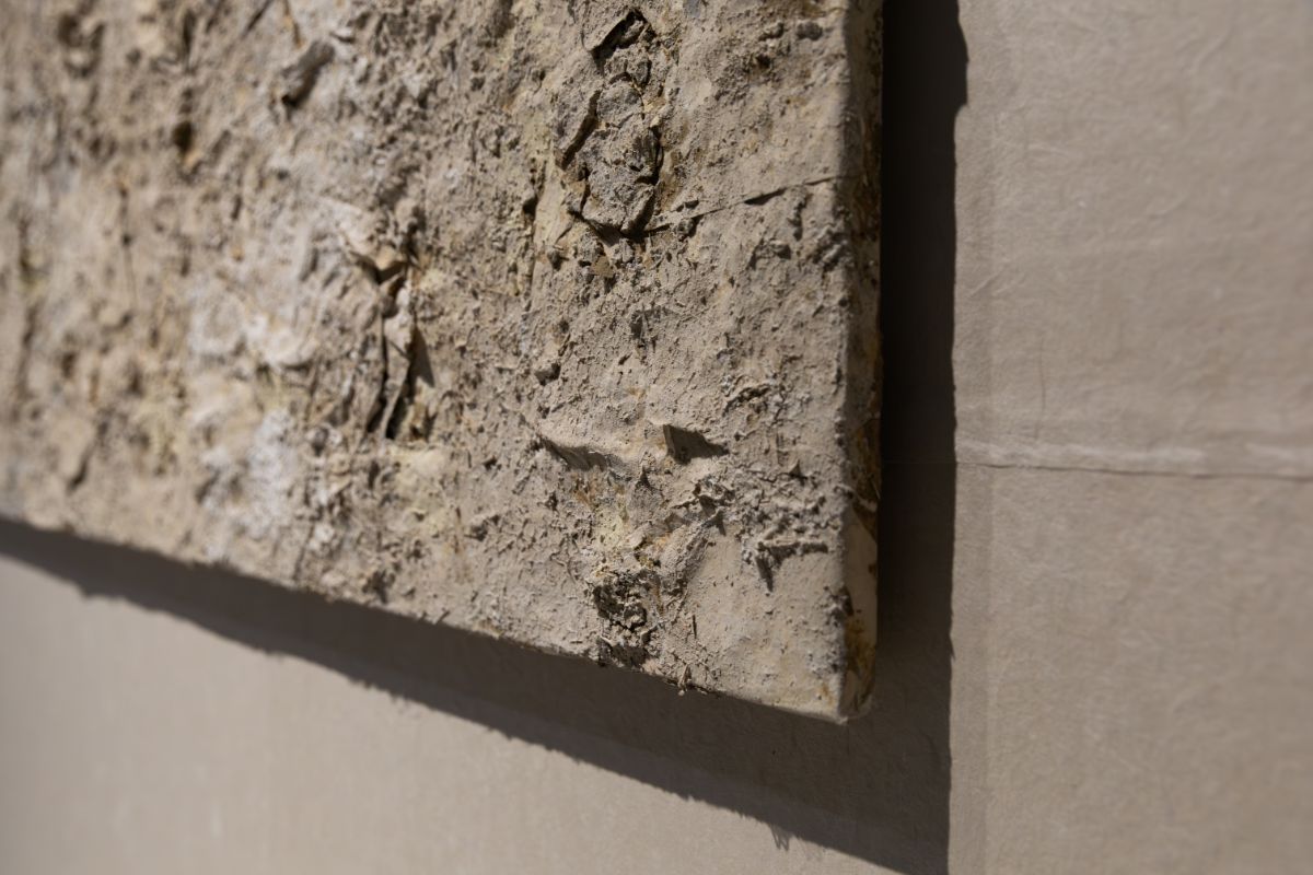 現代において失われてしまった闇を、ハタノさんは自分以外の何かを感じさせるものと位置づけている。闇のない世界では、人はすべてを理解し、コントールできるものとして捉えがちだ。闇のなかには常にぼんやりと「他者」がいて、畏れの対象であるとともに見守ってくれる存在でもある。壁面の『積み重なったもの』も、闇と光が一対でディスプレイされている。
