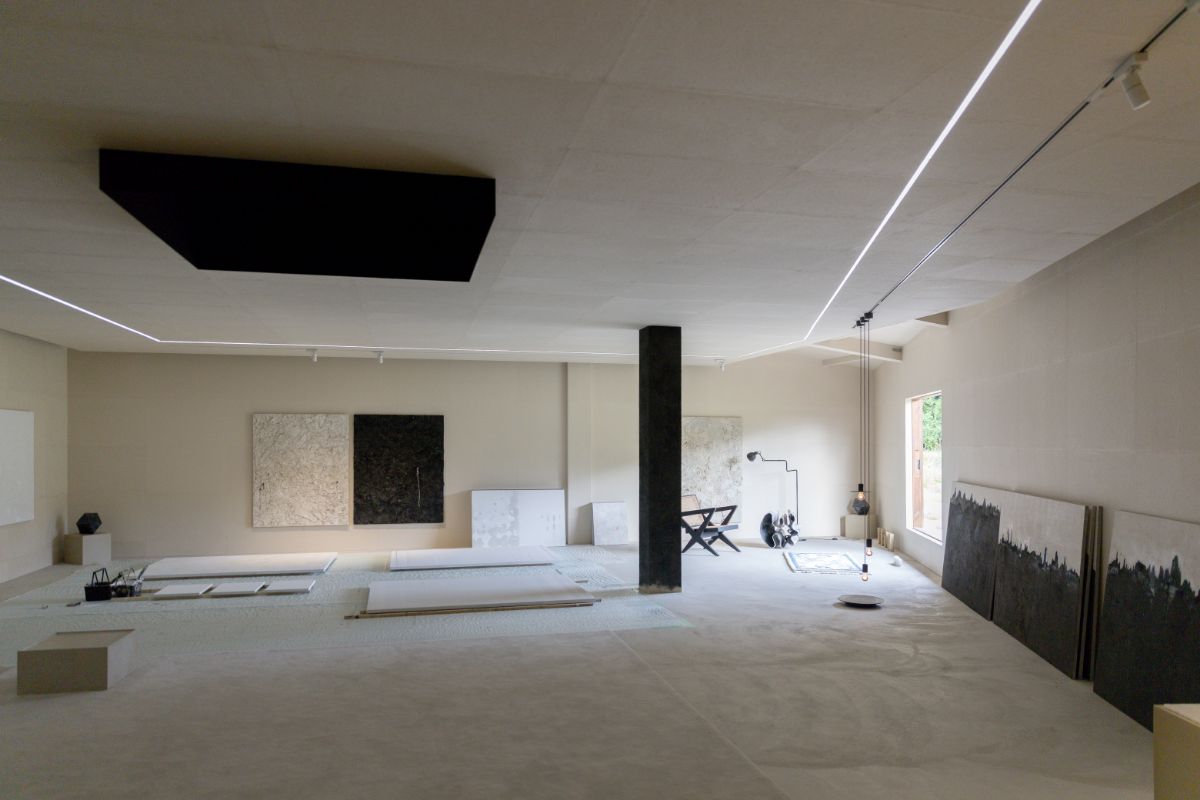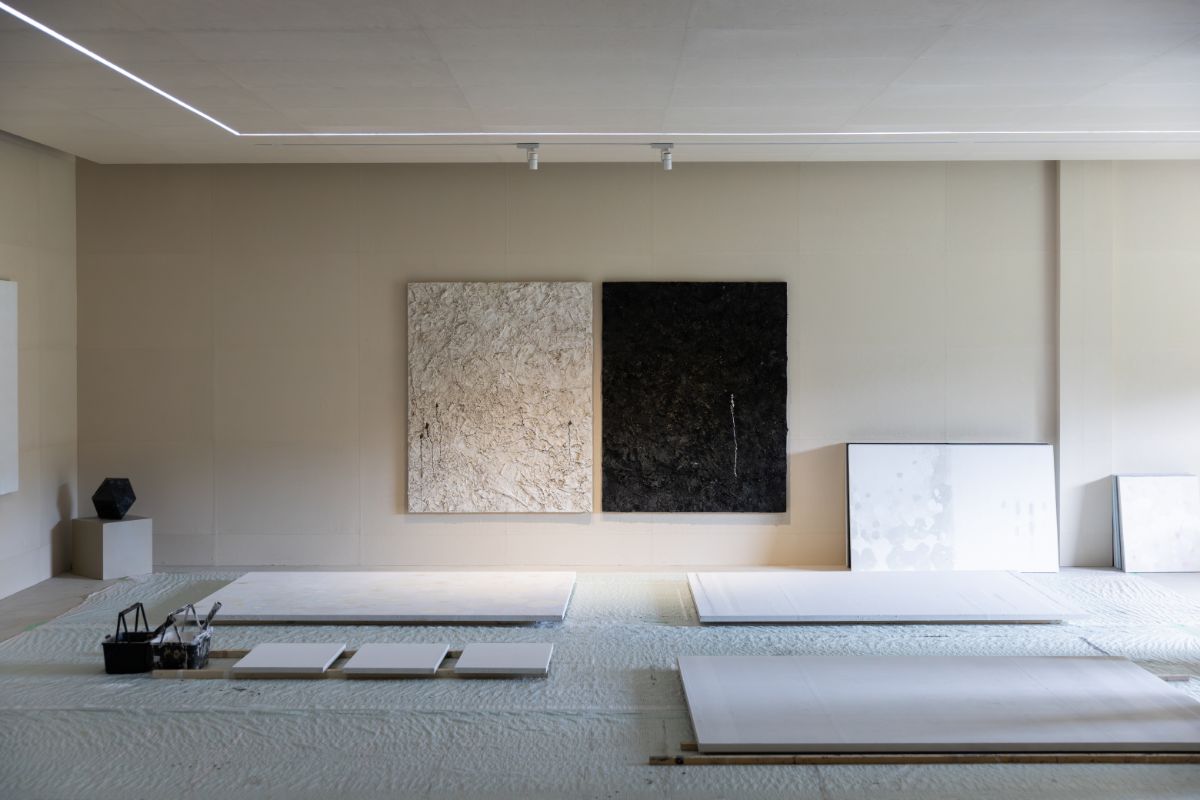 綾部市にあるハタノさんのギャラリー兼アトリエでは、彼の思いをはっきりと体感できる。仕切りのない広々としたスペースに、アートワークの代表作である『積み重なったもの』をはじめとする作品を常設。壁面など内装全体に和紙をふんだんに用いてあり、その心地よい奥深さが訪れた人を包み込む。特に印象的なのが、天井にある四角い「闇」だ。