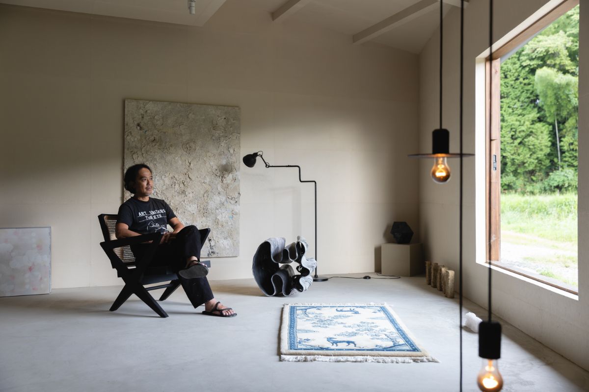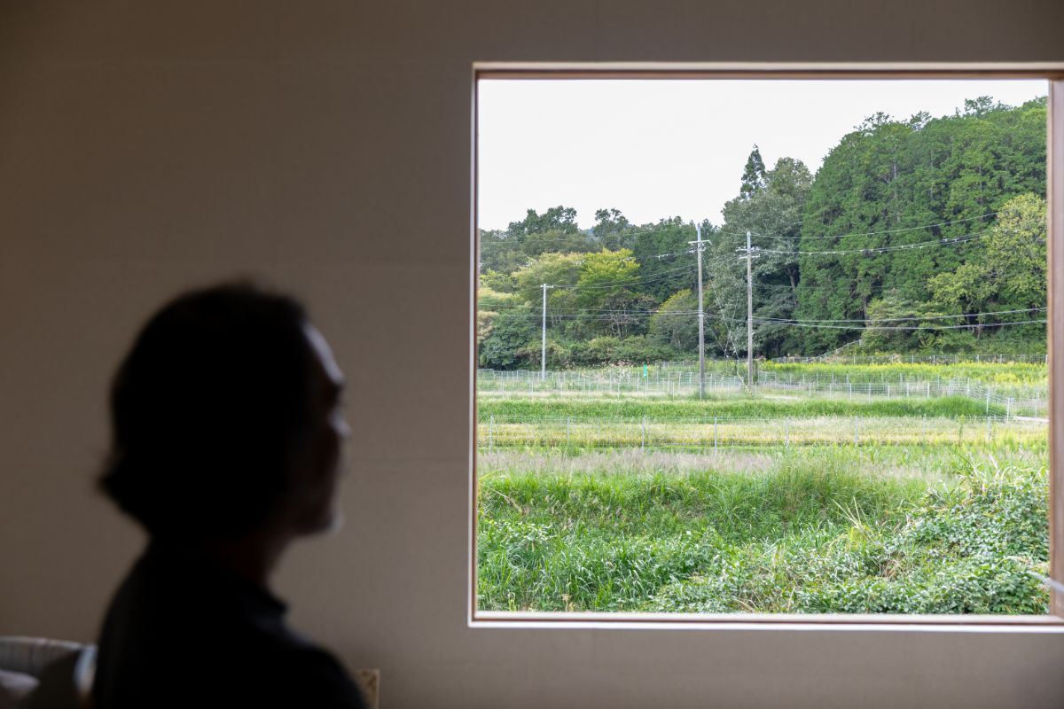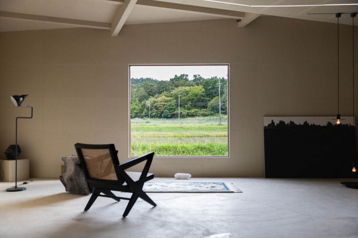 ハタノさんは日頃から、このギャラリーの一角に置いた椅子に座り、静かな時間を過ごすように心がけている。そばにある四角い窓の外は、青々とした山並み。隣接する土地には、もうすぐ庭をつくる計画がある。