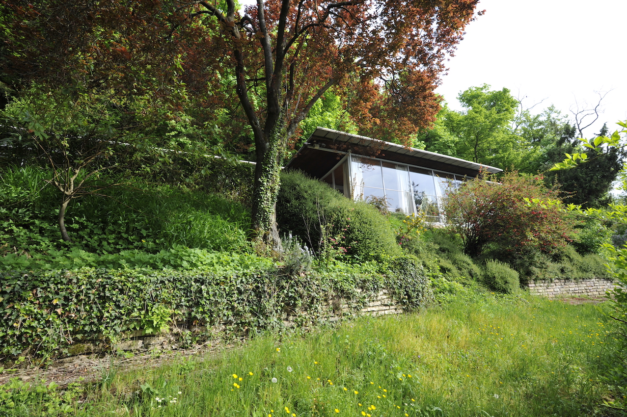 交渉も虚しく、株主主導による組織再編に伴い、所員を守るために工場からの退陣を余儀なくされたプルーヴェ。突然活動の場を失ったものの、たゆまぬものづくりの情熱が簡単に消えるはずもなく、街の中心部から30分ほど北にある土地を購入。事務所兼自宅の建築に取り掛かる。彼が購入した土地は街が一望できる南向きの高台だが、元ブドウ畑で勾配のきつい土地のため、簡単に重機を入れることはできない。そこでプルーヴェは最小限の労力で整地できるようにと、土地を水平方向に細長く整備していった。