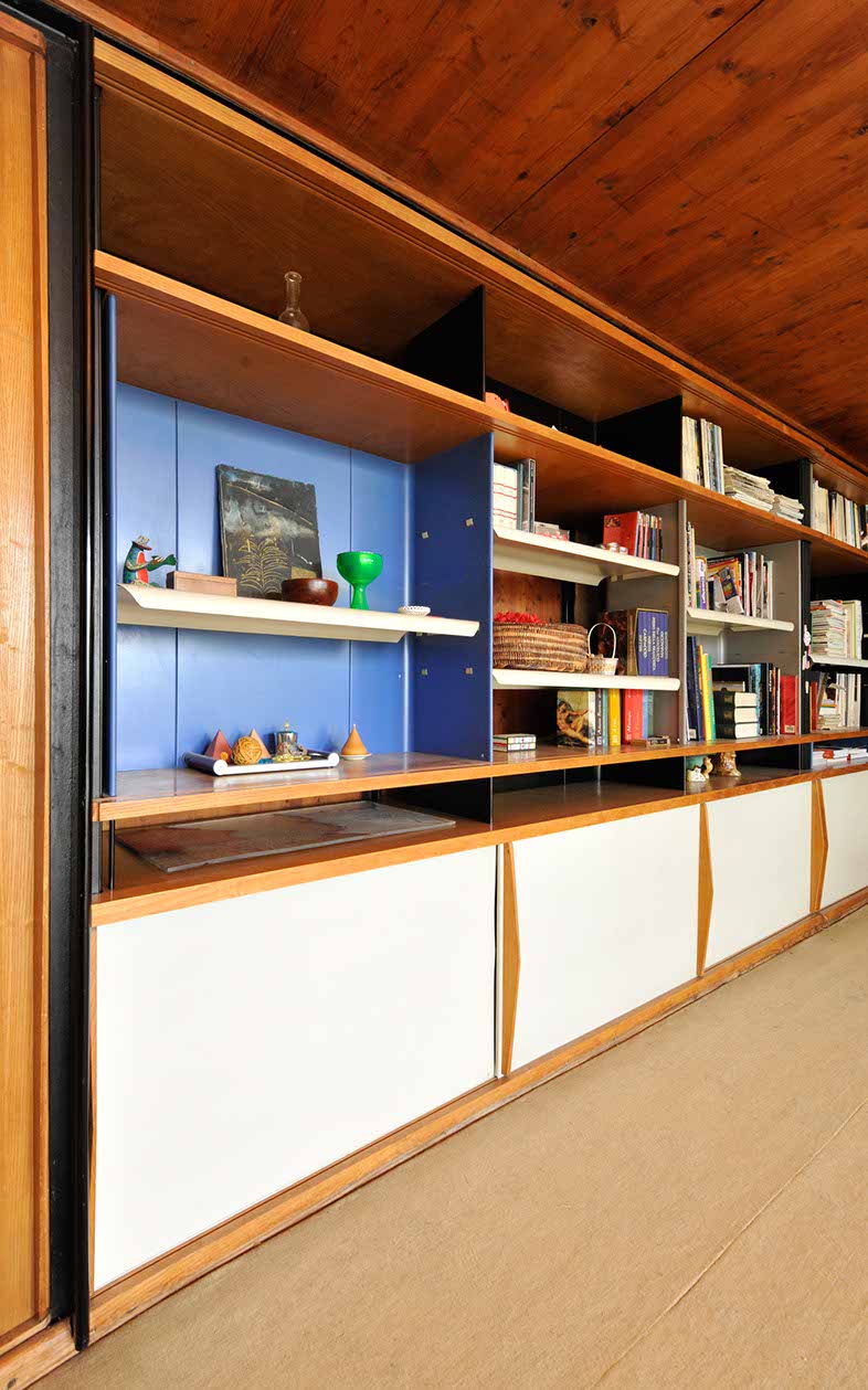 家はコンパクトながらも、プルーヴェが仕事をこなしながら、家族との大切な時間を過ごすための使い勝手の良い構成だ。エントランスの鉄製回転扉をくぐると、すぐ右手に40㎡ほどのリビングルームが広がる。南向きの大きなガラス窓からは山の緑とナンシーの街を見渡すことができ、反対の壁は一面が書架と収納として使えるようになっている。書架に沿うように左手に進むと、細い廊下の先にトイレと浴室、主寝室、子供部屋が続く。そして一番奥には、石壁が印象的な書斎も設けられている。