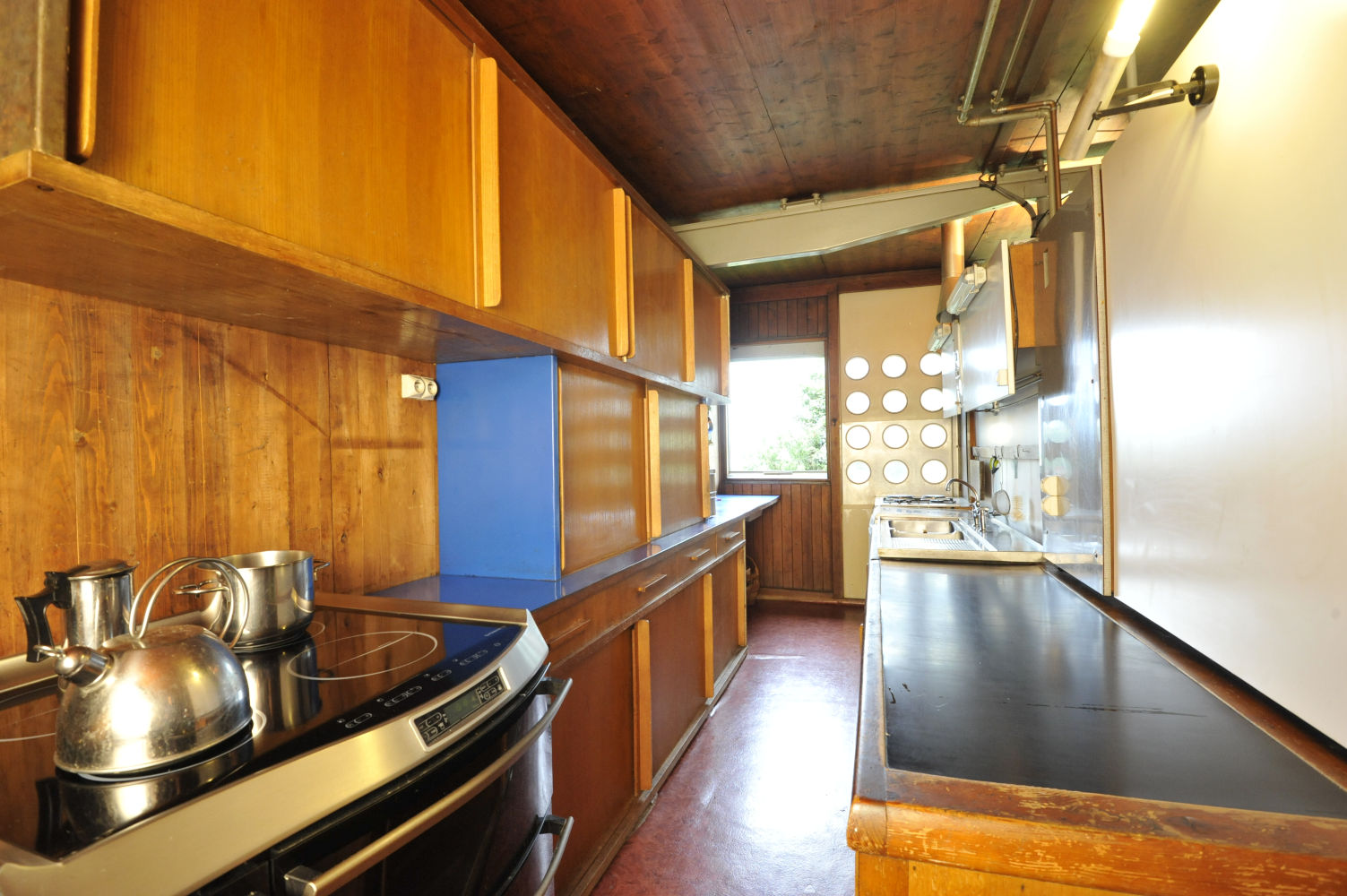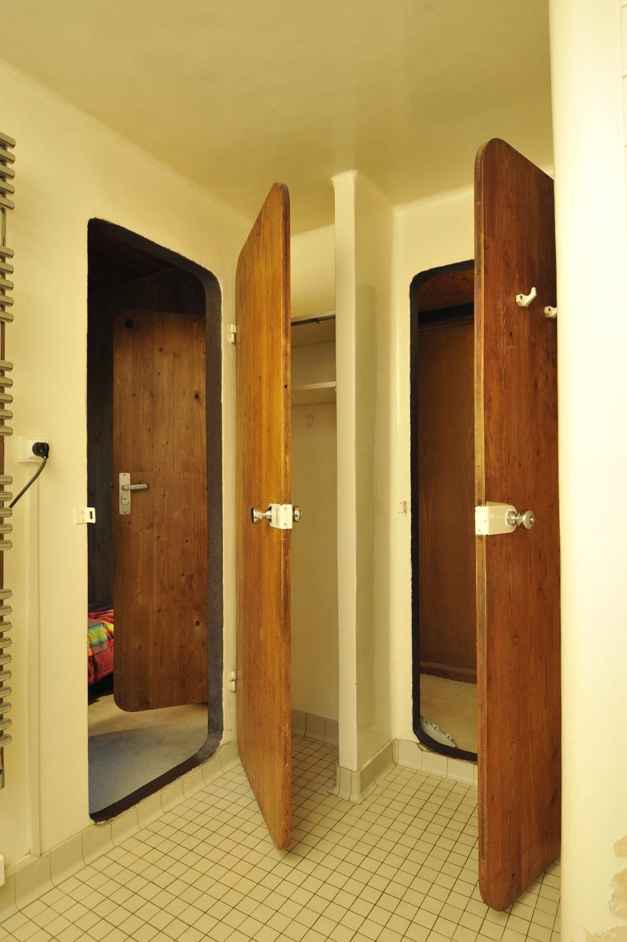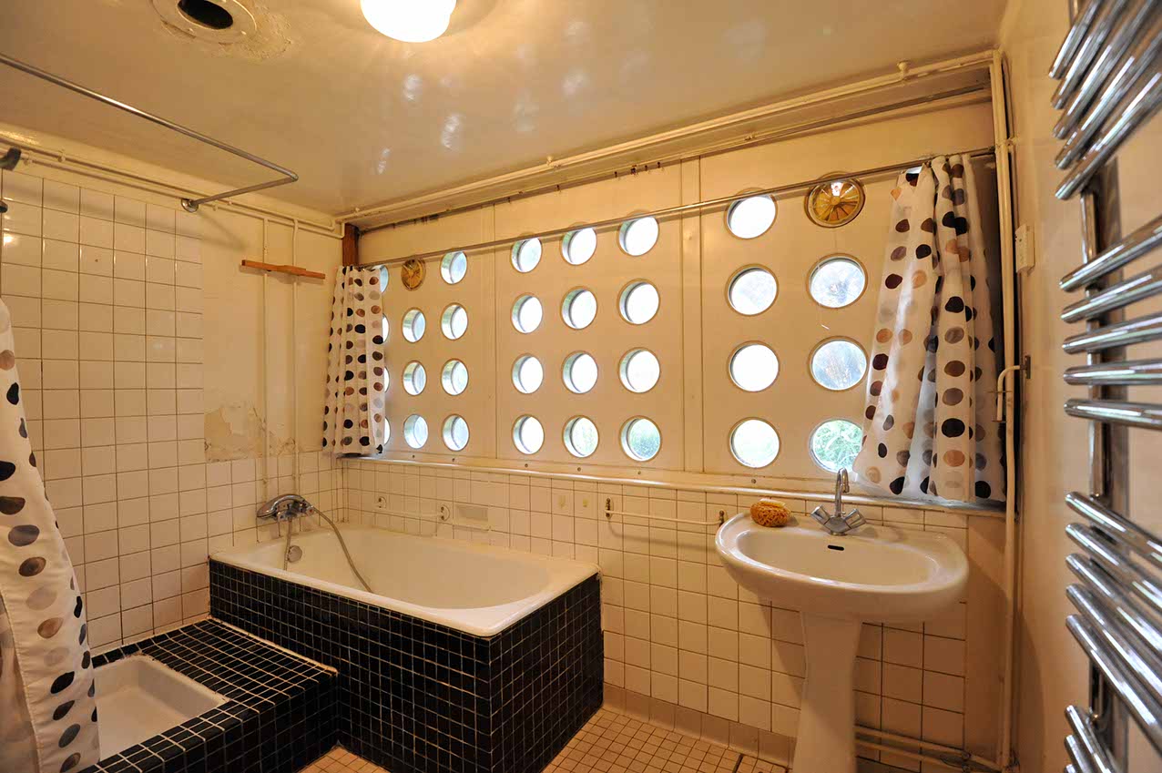 家のなかをくまなく観察すると、プルーヴェの名作の断片がそこかしこに見受けられるのもこの家の醍醐味だろう。眺めの良い大きなガラス窓があるリビングの天井を貫く梁には1949〜51年にかけてアフリカに建設した「メゾン・トロピカル」の床下を支えていた土台を再利用。ほかにも小さな丸窓付きの玄関ドア、主寝室と子供部屋に設置した上げ下げ窓も過去の物件で用いたものを流用している。
