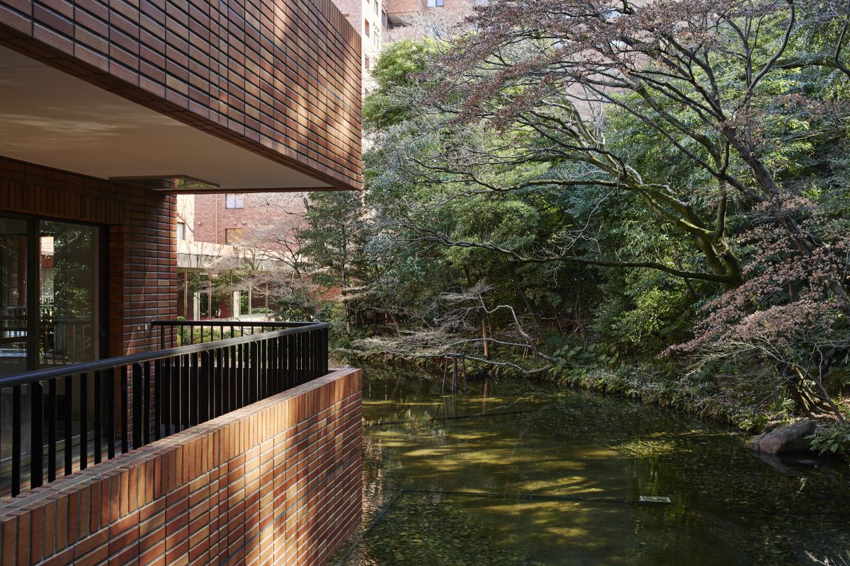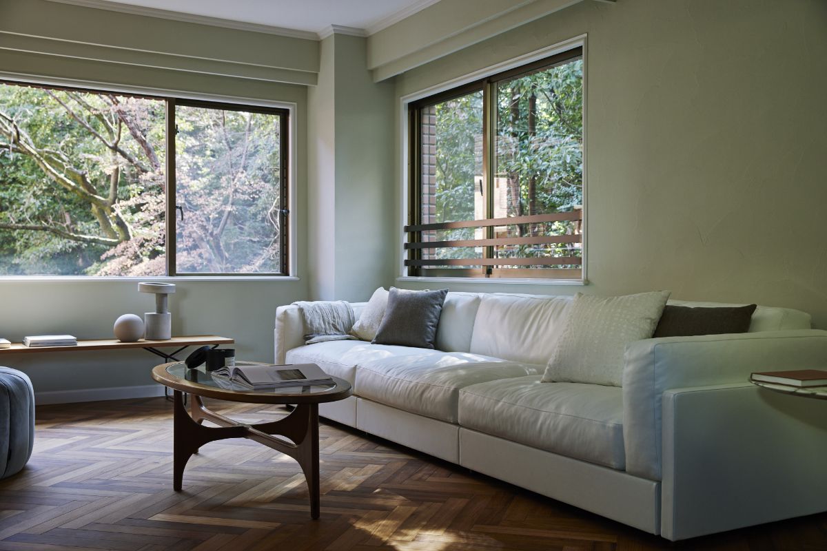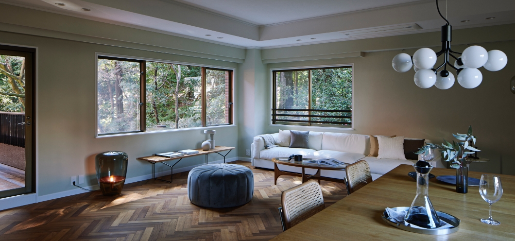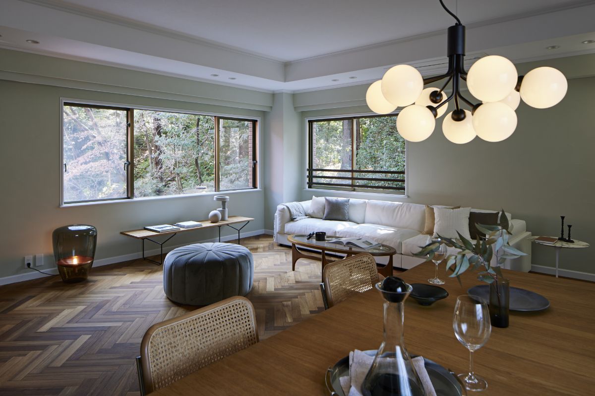 今回の舞台となるのは、東京都港区の高輪に位置する築約40年のヴィンテージマンション。品川駅から徒歩約5分という立地ながら、庭には大きな池があり、隣地には旧伊藤博文邸である「開東閣」の緑が広がるなど、都市の中にいることを忘れさせる豊かな自然環境にある。そのなかでもR100 TOKYOがリノベーションを手掛けた約200㎡の一室は、庭を間近に望む1階角部屋で、まるでリゾート地のような静謐な趣に満ちていた。エントランスから続く板張りの廊下の先にはリビングダイニングが広がり、庭に面した窓から明るい自然光が回り込む。天井には池の水面が反射し、心地良い揺らぎを生み出している。