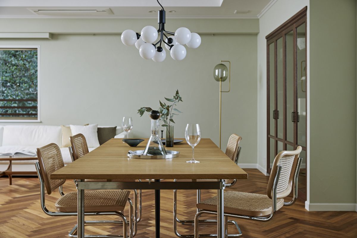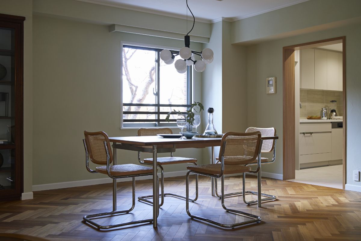 そこでダイニングにセレクトしたのが、北欧のデンマークを代表するデザイナー、ハンス・J・ウェグナーによるダイニングテーブルだ。天板には温もりあるオーク材が使われる一方、脚部は木材ではなくステンレススチール製。そこに合わせたマルセル・ブロイヤーによるチェアもスチールパイプと後脚がないキャンティレバー構造によって軽やかさを演出している。ヘリンボーン貼りの床や造り付けの木製キャビネットがクラシックな印象のリビングダイニングだが、家具によって軽やかでモダンな雰囲気に仕上がっている。