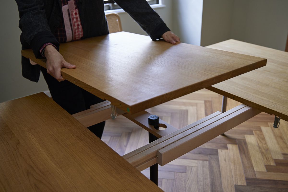 ダイニングテーブルの可変性は、空間の包容力を広げる役割も果たす。テーブルを囲む人数が増えたときはもちろんだが、たとえば夫婦それぞれに仕事や読書など別々の作業をしたいとき、適度な距離を確保することができる。書斎は別に用意されているものの、内容によっては人の気配を感じながら、あるいはいつもと気分を変えて作業をしたいシーンがあるかもしれない。さらにこのリビングダイニングにはソファや窓辺のベンチという居場所もあり、同じ空間にいながら自由に距離がとれる家具のセレクトとなっている。家具の性格と配置によって、リビングダイニングが“くつろぐ”“食事をする”だけの場所にとどまらないのが面白い。