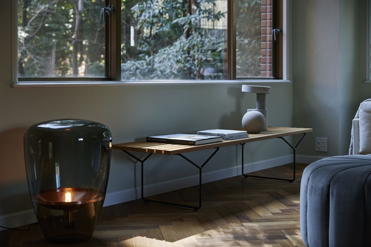 「ペンダントライトやフロアライトはキャンドルに近いオレンジ色の色温度に設定しています。さらに低い位置に暖かな光を配することで、日中や外部の光環境よりも柔らかな雰囲気をつくり、自然とオンオフのスイッチを切り替えています。また、ペンダントライト、スタンドライト、床に置いたフロアライトと、高さのバリエーションをあえてつくりました。ひとつの部屋にさまざまな高さの光があると居心地が良く、奥行きも感じられます」