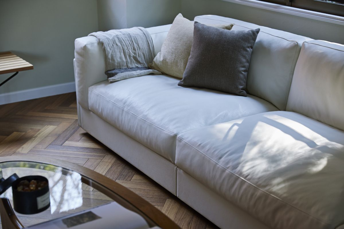 「2019年に発売された比較的新しいものですが、直線で構成され、無駄な装飾がなく、普遍的なソファの新たなアイコンとも言えるでしょう。僕たちが家具を選ぶときに大切にしていることのひとつに、タイムレスであることが挙げられます。着目するポイントは2つあって、ひとつはフォルムが流行に左右されず普遍的であること。そしてもうひとつは年月を経ても美しい素材を使っていることです。ソファにレザー張りを選んだのは、古くなったときの美しさを備えた素材だから。きちんとメンテナンスしながら使い込むことである種の美しさが増す。そんな素材の特性を分かったうえで、家具をメンテナンスしながら大切に使うことも暮らしの楽しみになります」