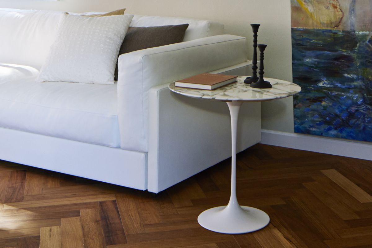 ソファの脇に置いたのは、細い一本脚が大理石の天板を支えるテーブル。アメリカの建築家・デザイナーであるエーロ・サーリネンが1950年代に生み出した名作だ。