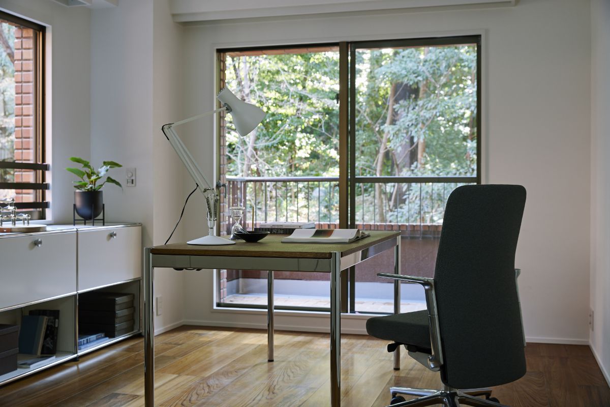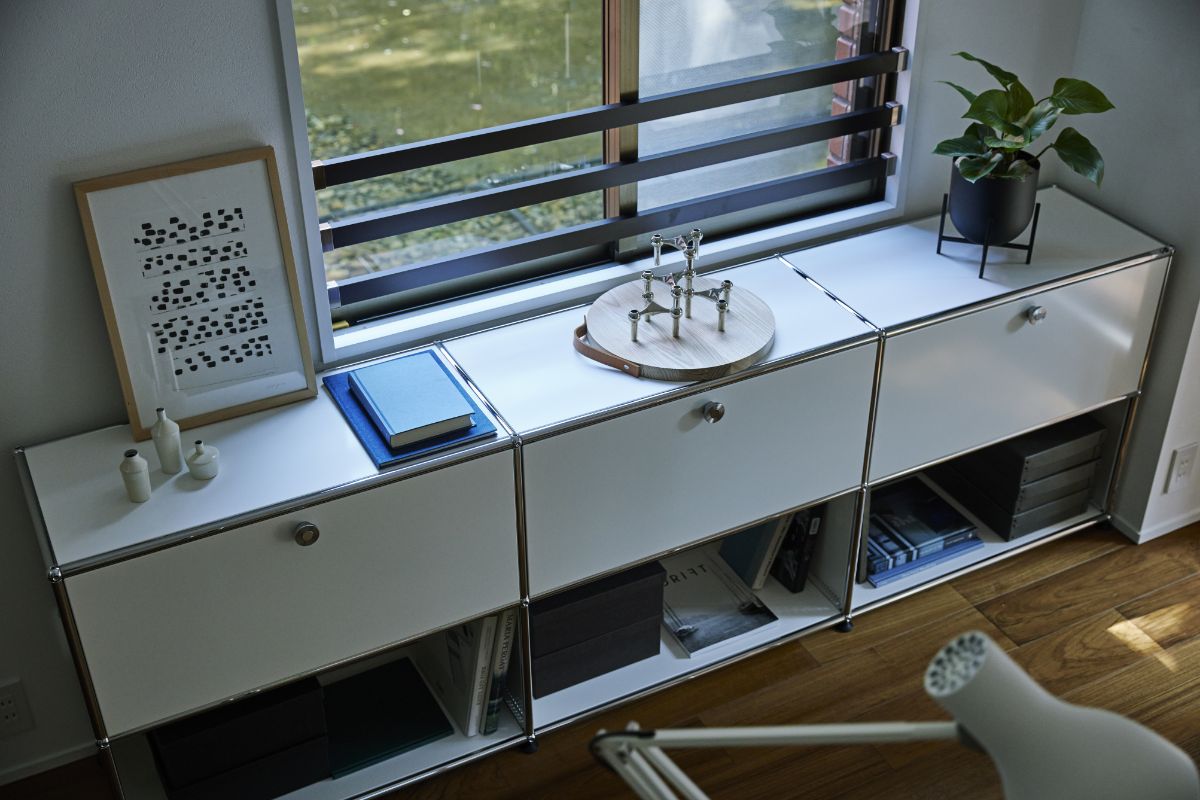 「やはり仕事をする場所ですから、いかに機能的、合理的にするかと考え、もともとスイスでオフィス用に開発されたモジュラー式システム家具「USMハラー」のデスクとキャビネットを選びました。機能性がとことん追求されたUSMハラーは構造がとても強固で、使い手の用途により自由に組み合わせることができます。1965年に発表されてからほぼモデルチェンジなしで、変わることなく世界中で愛され続けています。また、使いやすいUSMハラーのキャビネットは、ドレッサーやキッチン、バスルームの収納とするなど、ほかにもうまく取り入れられそうですね。一見武骨な印象ですがカラーバリエーションが豊富で、ヨーロッパでは住み手が自由に色を選んで取り入れている住まいをよく見ます」