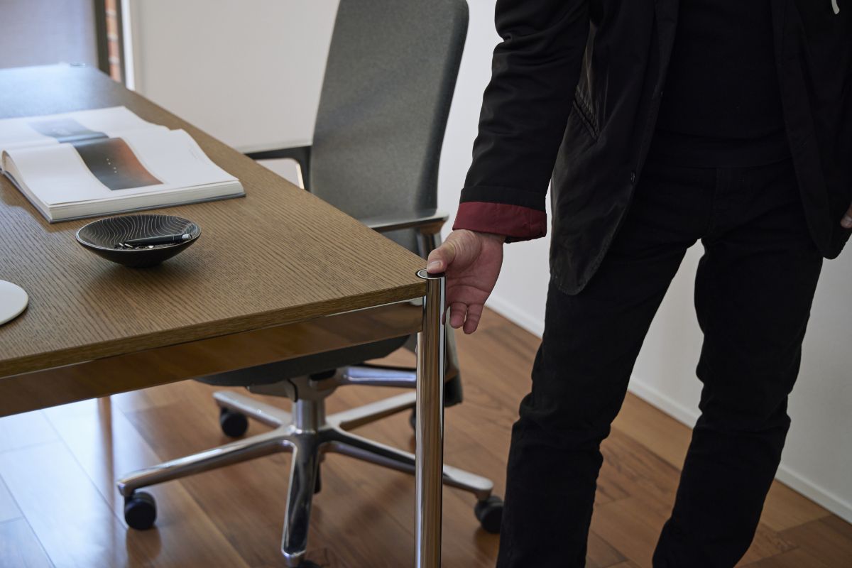 「USMハラーのデスクは四隅の最端部に脚が取り付けられていて、レッグスペースがゆったりと確保できます。デスク下にキャビネットワゴンを置きたい場合にも脚が邪魔をしないので使いやすい。天板と脚の接点をここまで最小限にとどめながら強度を保つのは、至難の業だと思います。限られた面積を有効に使いながら、機能的で仕事がしやすい書斎を実現するためには最適な家具ですね」