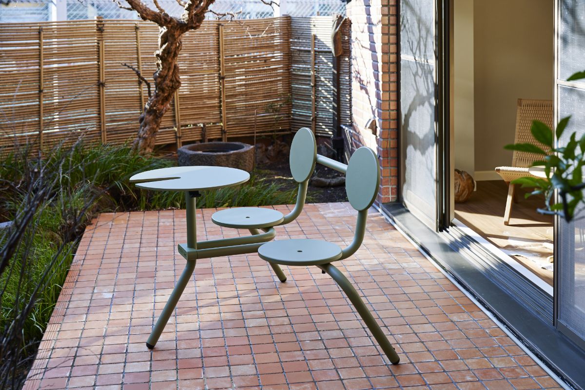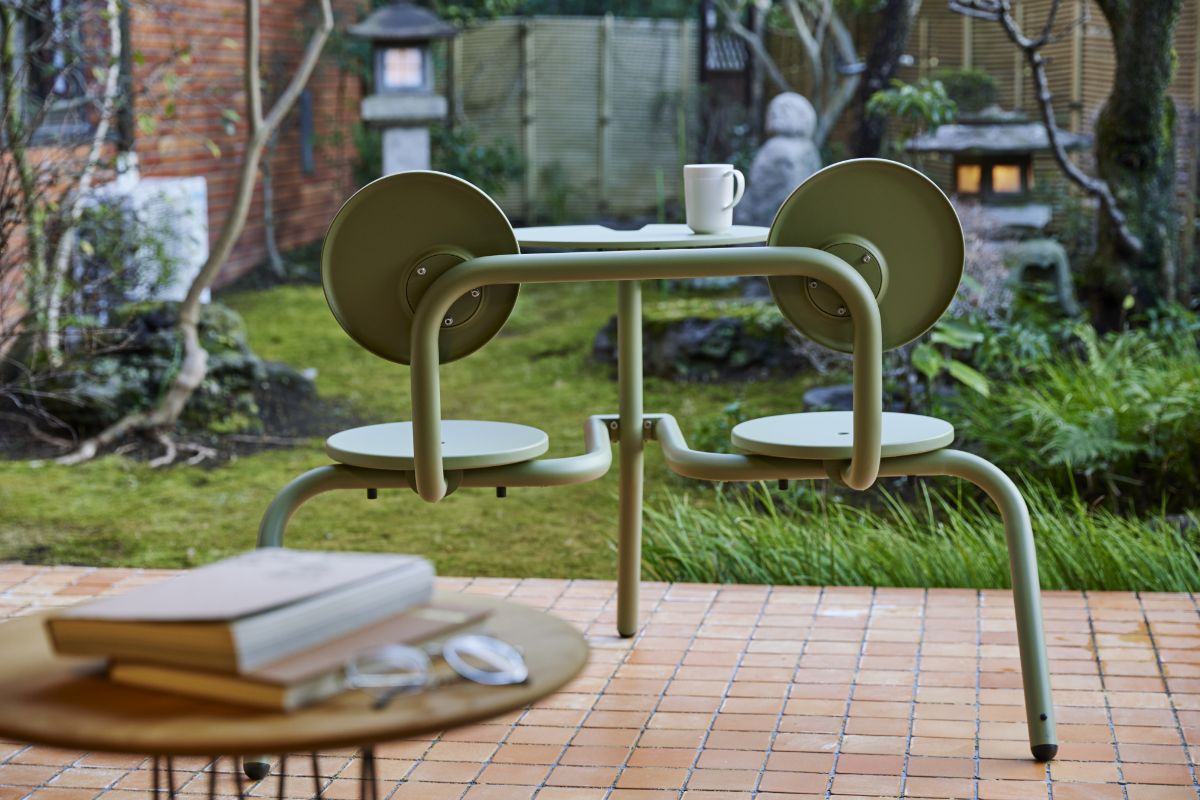 「横に並んで同じ未来を見る、というのがこのチェアのコンセプトで、そこに惹かれました。僕は妻と喧嘩するとドライブをしながら仲直りをするんですが、面と向かって話すよりも前を見ながら話すほうが本音で話せる気がします。プライベートな庭に、夫婦円満の秘訣になるガーデンチェアがあるのがなんだか微笑ましいですよね。落ち着いたトーンの色味も良くて、“リーフグリーン”が日本庭園になじんでいます。日本の住まいに違和感なくなじむ色だから、僕たちは抹茶グリーンと呼んでいるんです」