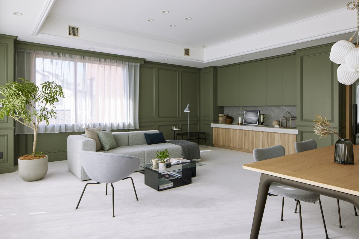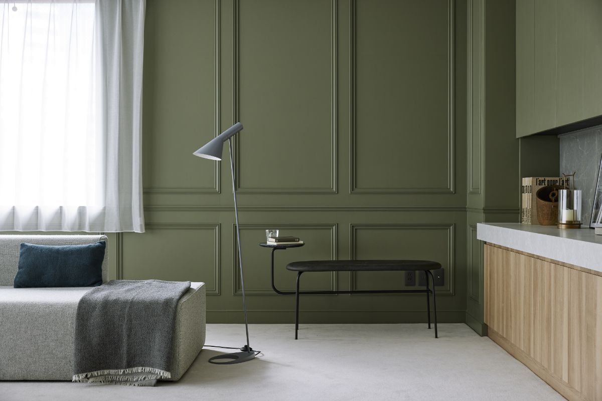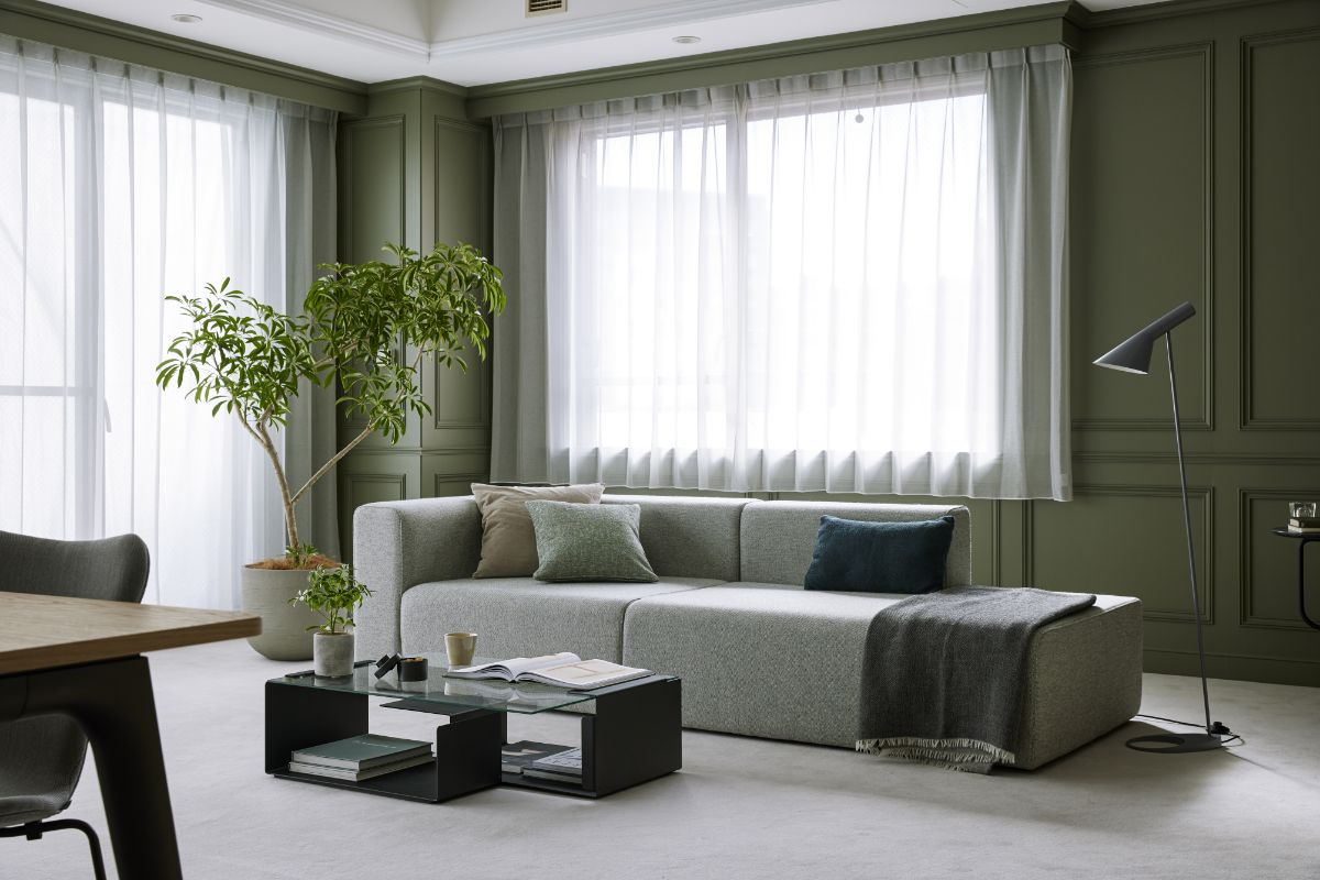 「主役はあくまでも壁のモスグリーン。さらにモールディングの陰影を考えて、家具の色は控えめに抑えました。そのなかで主張しすぎず溶け込みやすいグレーがグラデーションを描くように意識し、全体を引き締めるアクセントとして黒い家具をいくつか置いています」