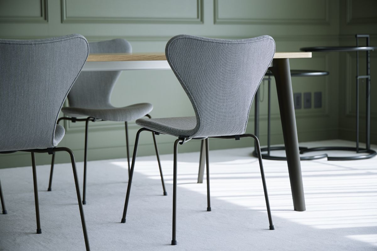 空間の個性を最大限に生かしながら、一定の価値観に基づいて家具選びを楽しむ。そう考えて最初に選ばれたのが、ダイニングの「Seven Chair(セブンチェア)」だ。デンマークを代表するデザイナー、アルネ・ヤコブセンにより1955年に生み出された名作で、実際に目にしたことがある人も多いだろう。しかし、「Seven Chair」と聞いてほとんどの人が思い浮かべるのは、木材でできた座面と背もたれにクロムメッキの脚がピカピカと光る、定番の佇まいではないだろうか。