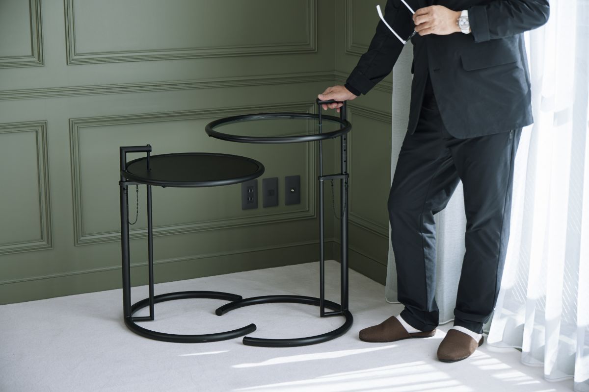 「ワインやブランデーを置くイメージで、ダイニングのサブテーブルがあったらいいなと思ったんです。食後酒の入ったバカラのデカンタなんかが似合いそうですね。これはフランスを拠点に活躍したデザイナー、アイリーン・グレイが1927年にデザインしたモダン家具のアイコンともいえるテーブル。もともとは彼女が自分の寝室で使っていたもので、ベッドやソファに差し込めるかたちになっていますが、ここでは高さの異なる2点を日本の“違い棚”のように組み合わせてみました」