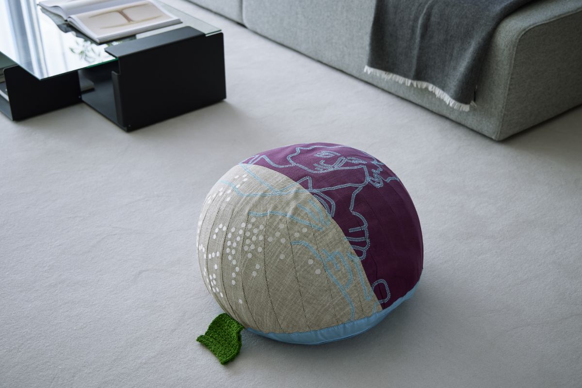 さらにもうひとつ、ソファやイスとは異なる体感が得られる場所として、スツールやオットマンとして使用できるビーズクッションを用意。ヨハネス・フェルメールの絵画『レースを編む女』をモチーフに、ユニークな刺繍が施されたものだ。