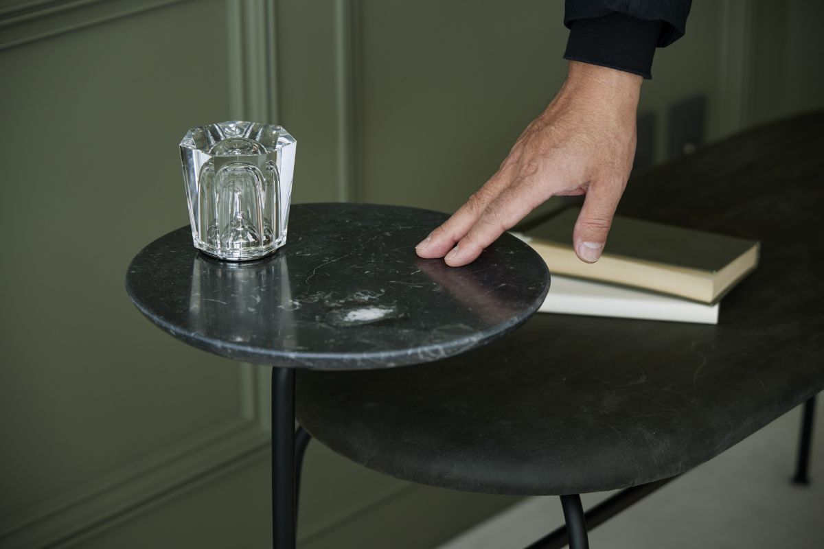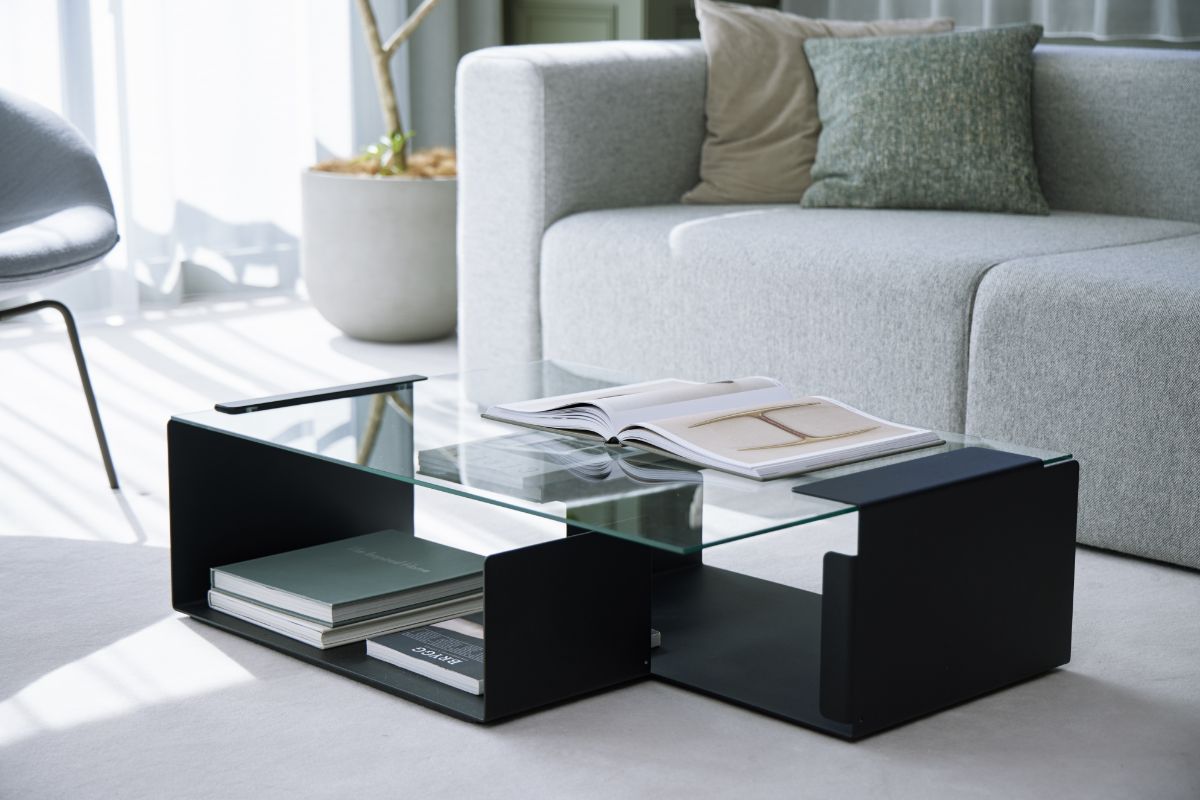 「実はこのサイドテーブルもクロム仕上げが定番ですが、あえて黒の塗装で素材感を消したものを選んでいます。天板は、ひとつは黒の塗装、もうひとつはクリアガラスと異なるものを選んで遊び心を表現しました」