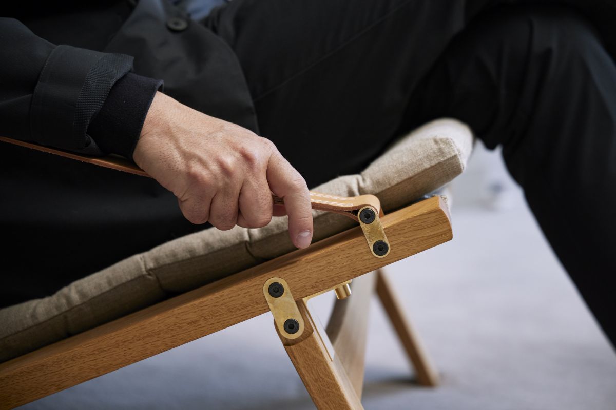 「ラウンジチェアに腰掛けると、レザー製ベルトの肘掛けにかかるテンション、フレームの木材の温もり、少し角が立った真鍮の金物などに手が届き、手触りでもその素材感が楽しめるんです。素材感が強いからこそ、経年変化も楽しみなアイテムですね。ベルトが野球のグローブみたいにこなれてくると、愛着も増すはずです」