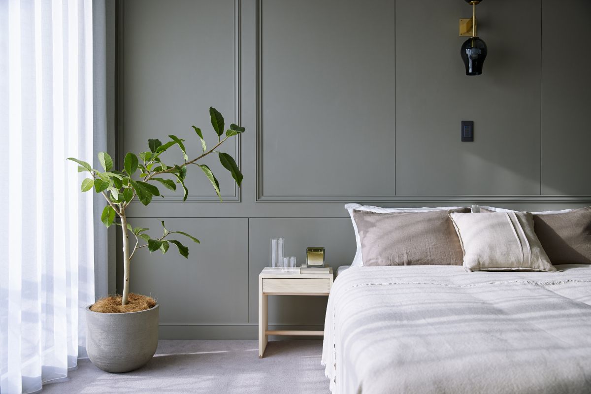 「主寝室も全面の壁が木製パネル仕上げで、こちらはモスグリーンではなくグレーで塗り込めています。やはり塗り込めるという共通点があるので、空間の印象はリビングダイニングと似ています。プライベートな場である寝室では、もう少し異なる感覚で過ごしてほしい。そう思ったので、ここではリビングダイニングとは対照的に素材感が強い家具を選び、壁とのコントラストを描こうと考えました。ありのままで過ごすプライベートスペースだから、塗装されていない無垢なものが合うかなというイメージもありました」
