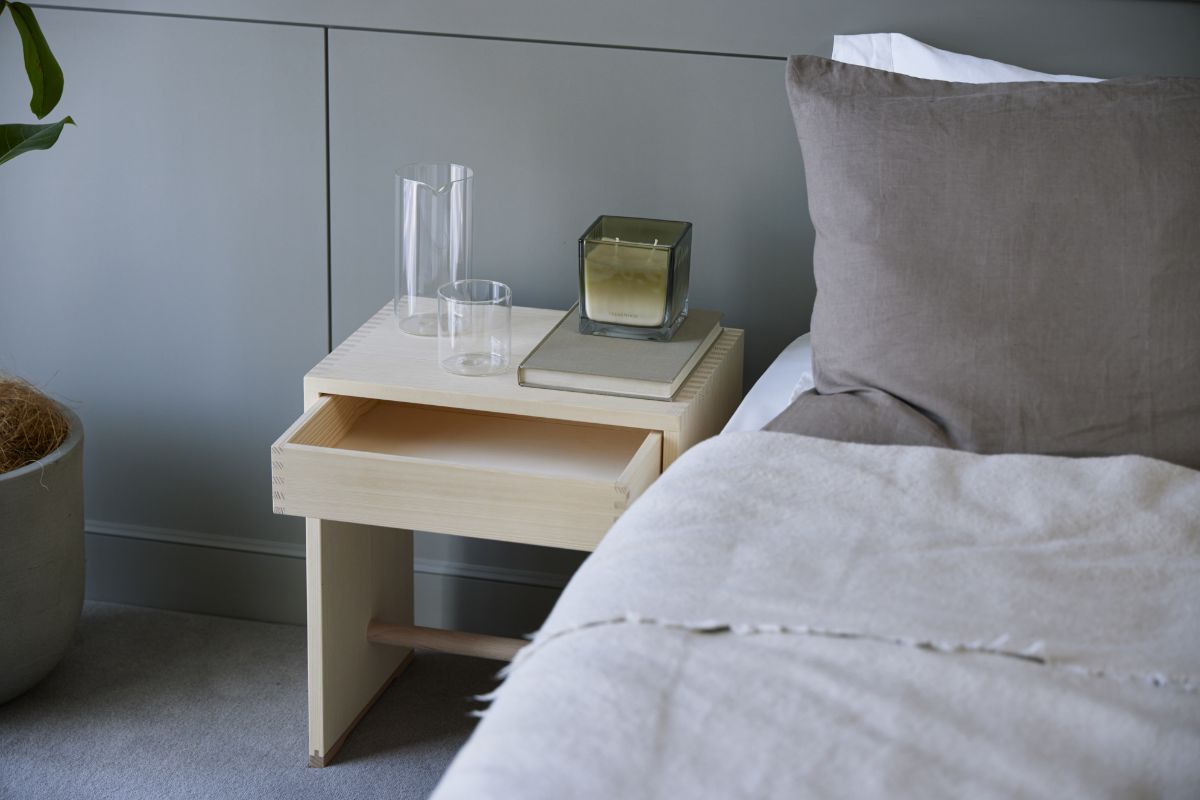 また、ベッドの両サイドに配したテーブルは、もともとスツールとしてデザインされたもの。ドイツのウルムにあった「ウルム造形大学」の学生のために、開設当時の学長でありデザイナーのマックス・ビルと、アシスタントであったハンス・ギュジョロが創作した。