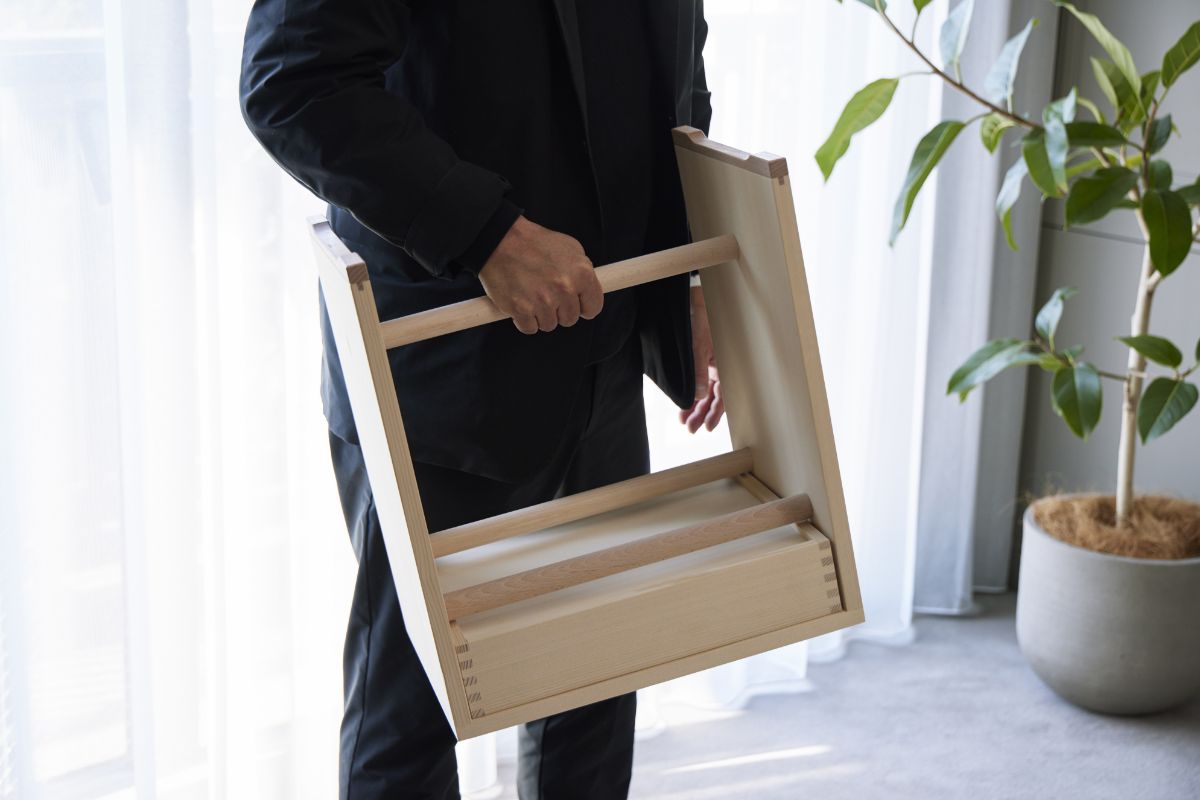 「ここに選んだのは引き出し付きの仕様ですが、オリジナルには引き出しはありません。シンプルなコの字形の家具で、逆さまにすると下の丸い棒の部分が持ち手になって運べます。座面の裏側に教科書や画材などを載せれば、学校内を移動するためのキャリーケースにもなる多機能なアイテムなんです。無塗装のナチュラルな素材感が、塗り込めたグレーの壁に映え、面白いコントラストを描いています」