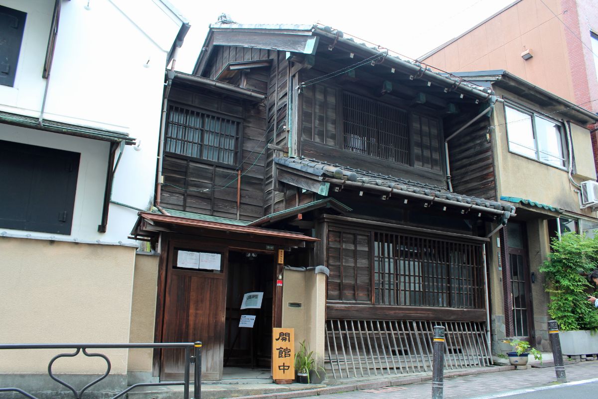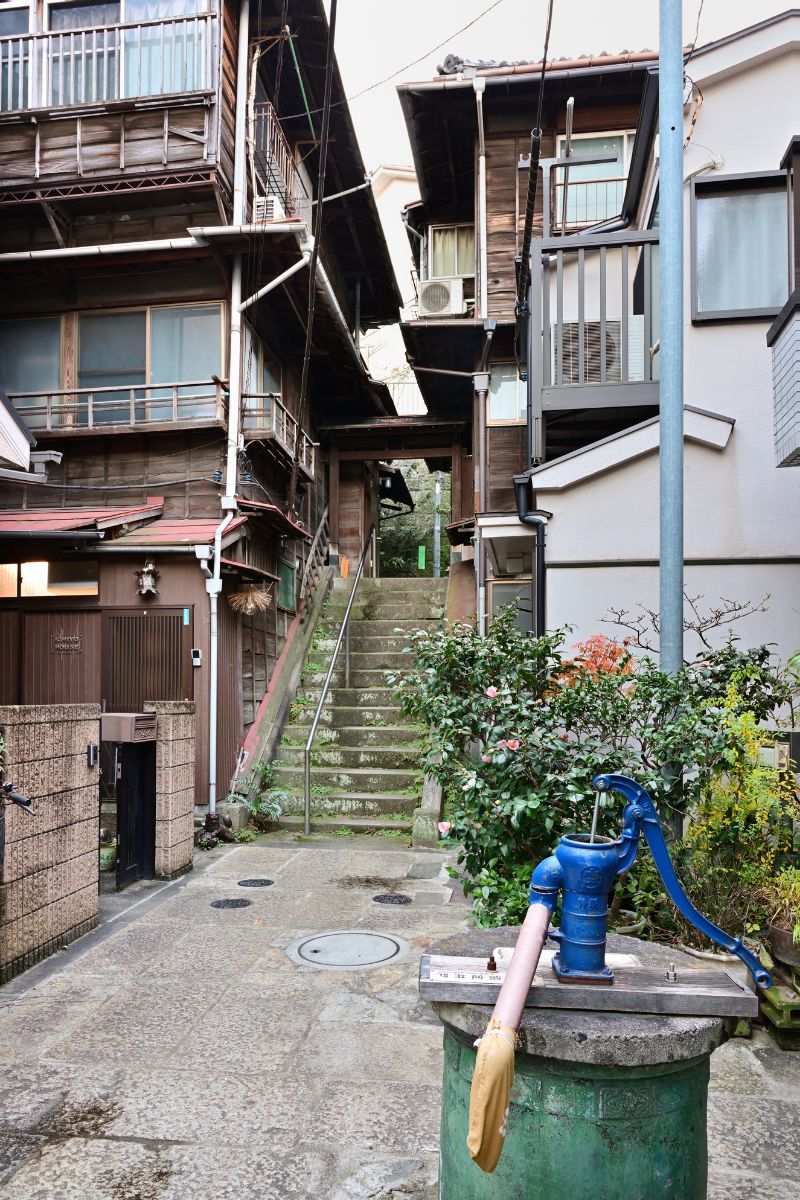 水といえば、暗渠道の南方の袋小路めいた一角にポンプ式井戸があり、井戸前の家に樋口一葉が10年くらい暮らしていたという。グーグルマップなどに「旧居跡」の表示が出るが、この路地の突きあたりに木造3階建ての下宿屋風の建物があって、石段を上って奥へ進んでいくと、裏方の鐙(あぶみ)坂の途中に抜けられる。そのすぐ横に「金田一京助・春彦旧居跡」のプレートが掲げられている。